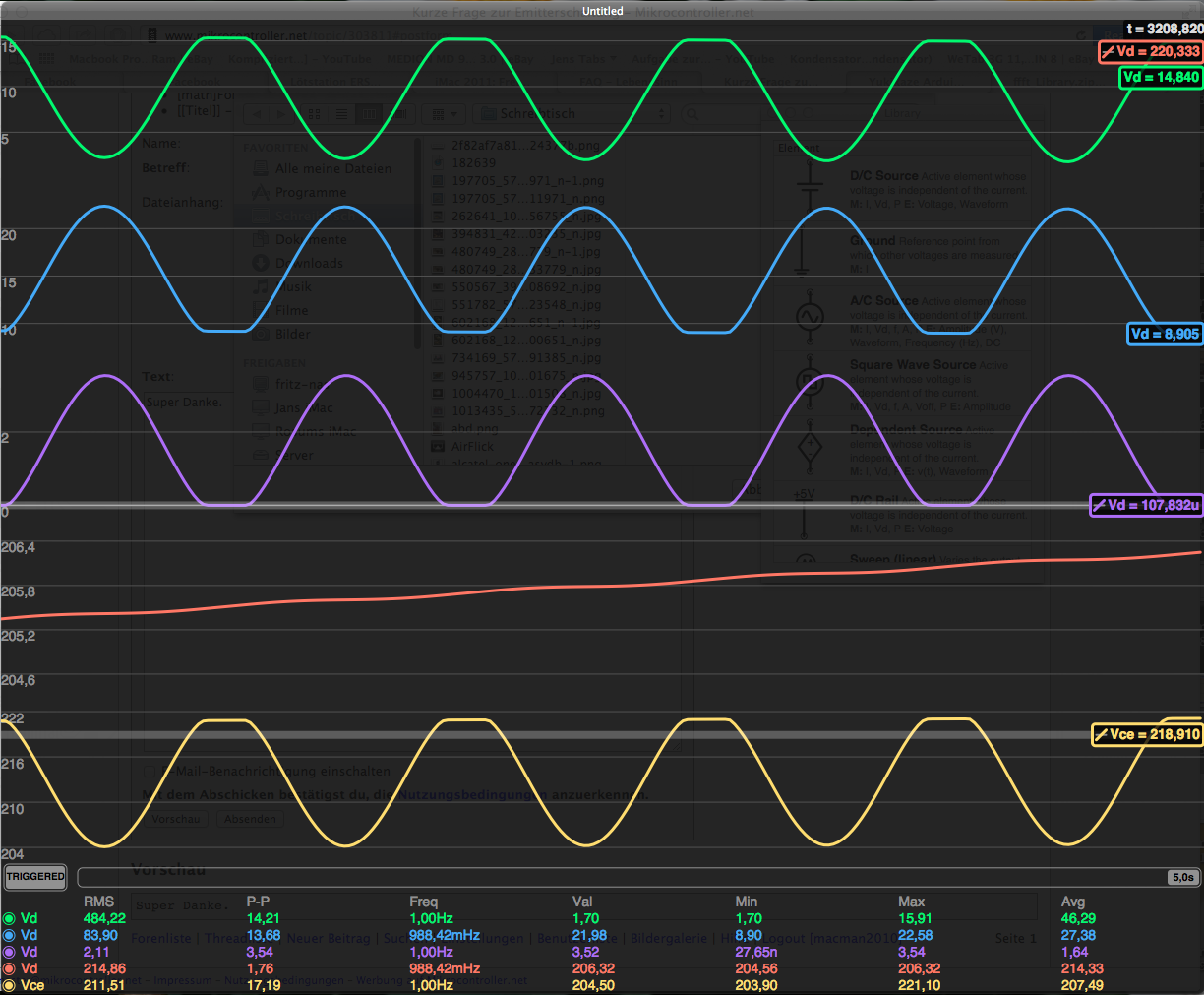 Hallo, noch eins, bist Du sicher das Du "nur" 230V hast???? Wenn Du tatsächlich an das Stromnetz mit 230V Wechselstrom gegangen bist dann musst Du wissen das die 230V nur der Effektivwert sind. Auf dem Oszi wirst Du die Spannung um den Faktor 1,414 mal höher sehen. Ausserdem sollte man gewisse Erfahrungen bei diesen Spannungen mitbringen. Für Anfänger ist das in keiner Weise empfehlenswert!!! Gruss Klaus.