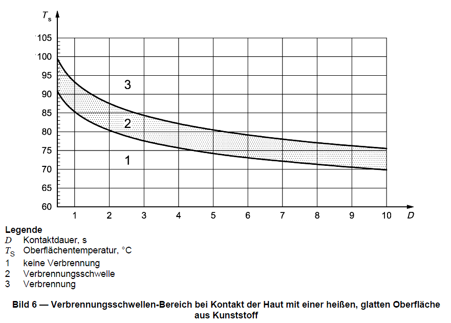 Lothar S. schrieb: > Die Grenztemperatur zum Berührungsschutz ist allgemein 65°C. > Bei dieser Temperatur reicht die menschliche Reaktionsgeschwindigkeit > noch aus um eine Verletzung/Verbrennung zu verhindern. Wo kommt dieser Wert her? Das Diagramm ist für Kunststoffoberflächen aus EN ISO 13732-1, "Ergonomie der thermischen Umgebung - Bewertungsverfahren für menschliche Reaktionen bei Kontakt mit Oberflächen". Nur bei mehr als 1 min gilt danach 60°C.