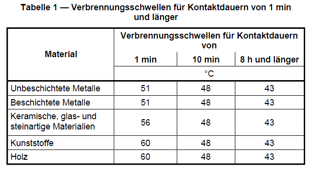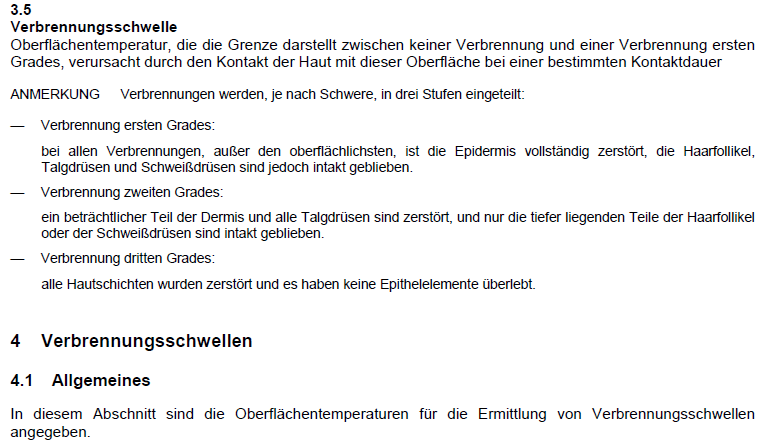 43°C ist DER allseits bekannte Grenzwert bei Geräten / Maschinen. Wird ein dauerhaft anzufassendes Teil (z. B. Handgriff) heißer als diese Temperatur, sind zusätzlich Schutzmassnahmen notwendig. Entweder von Herstellerseite oder die Betriebsanleitung schreibt eine "PSA" (persönliche Schutzausrüstung) vor, z. B. Handschuhe. Wie eine Verbrennung definiert ist steht auch in der Norm (3.5). Im Anhang die Kurzdefinition, es gibt dort noch mehr dazu (4), alles will ich aber nicht einstellen.