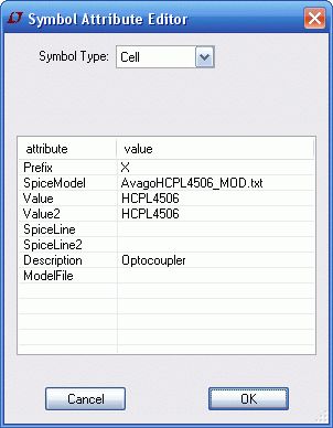 Durch die Wahl de Attribute ist das Bauteil davor geschützt im Schaltplan modifiziert zu werden. Genau so sind fast alle Symbole von Linear Technology auch. Zum Editieren musst du die Datei(.asy) mit dem Symboleditor öffnen. Im Prinzip gibt es drei Arten Von Symbolen. 1. Das spezifische Symbol (siehe mein Beispiel), nicht änderbar im Schaltplan 2. Das universelle Symbol, Subcircuit name im Schaltplan änderbar+Parameter 3. Das Auswahl-Symbol, "drop down"-Menu zur Auswahl