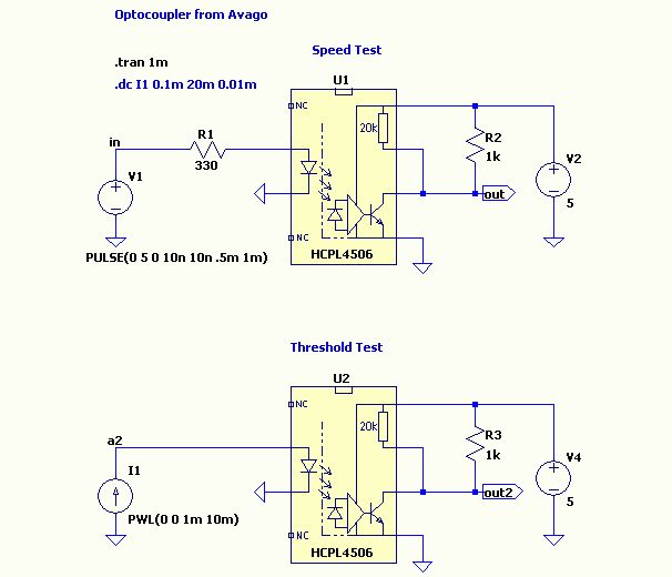 Ein Tipp noch zu Optokopplern in LTSpice: Wenn auf "beiden" Seiten des OK ein Pin der Teilschaltung auf 0 liegt funktioniert die Simulation in der Regel. Ist eine der Teilschaltungen aber nicht an GND, was bei Optokoppleranwendungen durchaus üblich ist, hilft es im allgemeinen den OK mit einem 10 bis 100 Mega-Ohm R zu überbrücken und die Simulation läuft. Ohne R gibt es Fehlermeldungen oder unsinnige Ergebnisse, so meine bisherigen Erfahrungen mit LTSpice.
