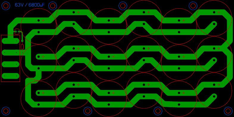Hallo, Ich habe eine CNC Fräse mit einer Servosteuerung und brauche eine Kondensatorbatterie dafür. Das Netzgerät geht doch schon in die Knie wenn alle Achsen gleichzeitig losfahren. Die Kondensatorbatterie soll genügend Spannung speichern um den Anlaufstrom zur Verfügung zu stellen. Viele Dinge müssen wohl beachtet werden und ich möchte da nicht unbeding das Netzteil zum Abrauchen bringen. Deswegen bitte ich hier um Hilfe. Das Netzteil ist ein Mean Well PSP-600-27 Und die Steuerung ist von CNC-Drive mit Whale Drive. Die Motoren sind angegeben mit 150 Watt, 30Volt und 5 Ampere. Folgende Kondensatoren habe ich hier 25Stück. 63 Volt und 6800uF. Die Spannung bzw Strom sollte für eine Sekunde durch die Kondensatoren zur Verfügung stehen. Wie berechnet mann sowas eigentlich???? Wie gestalte ich das Ganze am Besten. Worauf sollte ich unbedingt achten. Ich würde gerne irgendwie ein Relais und Entladewiederstand mit einbringen. Zusätzlich soll bei ausgeschalteter Spannung des Netzgerätes die Kondensatorbatterie über das Relais getrennt und entladen werden. Nicht das die Spannung in das Netzgerät läuft und mir das Netzgerät Zerstört und die Spannung soll unbeding aus den Kondensatoren verbraucht werden. Nicht das auf den kondensatorren immer Spannung ansteht. Zudem möchte ich da noch ne LED als Ladezustand mit einbringen. Damit ich erkennen kann ob Spannung an steht oder nicht. Ich hatte schon mal was mit Sprint Layout gemacht. Habe ich Angehangen, Irgendwie so soll das dann mal Aussehen. Ist nur ein Entwurf nicht das Ende der Batterie. Ich hoffe ihr könnt mir da Ratschläge geben. Danke schon mal im Vorraus. Gruß Thomas