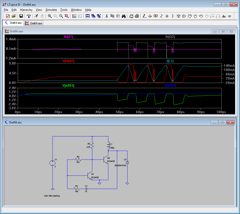 @ Axel: danke dir, das werde ich sacken lassen. Hilft aber danke für die Mühe. Ich habe einfach nach aufzuladenden Kondensatoren gesucht. Im obigen Oszillogramm ist V(n002) ja die Kollektorspannung von Q2. Ich meine tatsächlich zu sehen, daß die exponentiell ansteigt. Sättigungstrom glaube ich ist nicht vorhanden, ich habe einfach das 'L' aus ltspice genommen. Schwingt aber dennoch.