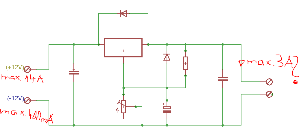 Ich hab eigentlich nicht viel Ahnung von neg. Spannungen, deswegen meine Frage. Ich weiß, dass wenn ich +12V als Vcc und -12V als GND annehme ich +24V zur verfügung hab. Im angehängetn Plan sieht man auch die max. Ströme. Kann ich am Ausgang 3A ziehen obwohl die -12V nur max. 400mA hergeben? Oder funktioniert dass nicht? MfG