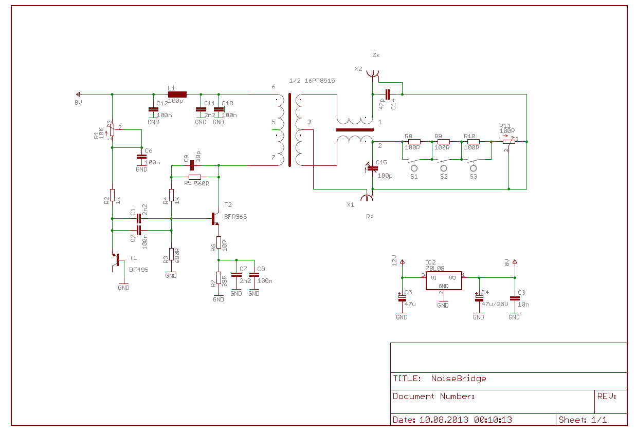 Ich bin immer noch begeistert von der Rauschbrücke, die ich in den 80er Jahren aufgebaut hatte. Wichtig dabei ist die HF-mäßig sinnvolle Plazierung von Abgleichkondensator und -widerstand ( ich hatte beide rechtwinklig zueinander ins Gehäuse gesetzt ); als variablen Widerstand hatte ich einen mit 250 Ohm auf einem Keramikträger benutzt ( gibt es wohl nicht mehr so zu kaufen ). Die Brücke funktionierte bis etwa 15 MHz gut, was mir damals für die Anpassung von Dipolen über gamma-match völlig reichte.