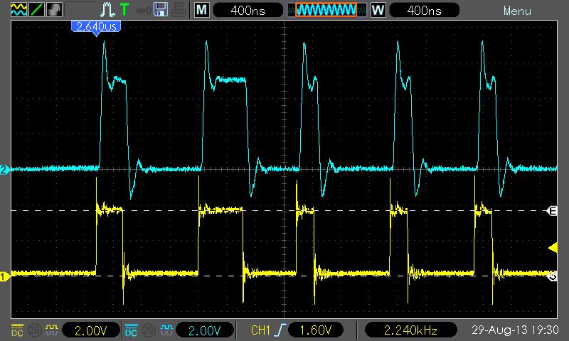 Torsten C. schrieb: > Bugs schrieb: >> wurde schon ausgeschlossen, das das Timing nicht passt? > Sorry, den LA schließe ich wohl erst am Wochenende an. Also das Timing war OK. Der Logik-Pegel war zu klapp: Je länger das Kabel oder je größer die Versorgungsspannung der LED desto mehr Fehler. Im Bild: Blau: Am Ende des 3m-Kabels, nun mit 74HCT14 davor Gelb: Ausgang vom STM32F4 Discovery (74HCT14-Eingang). Kennt Ihr alle den neuen Artikel WS2812 Ansteuerung?