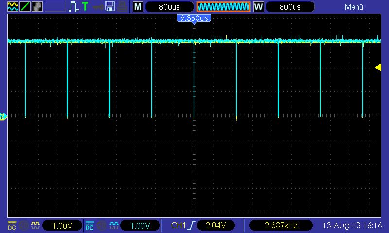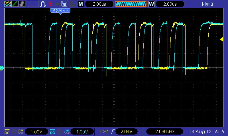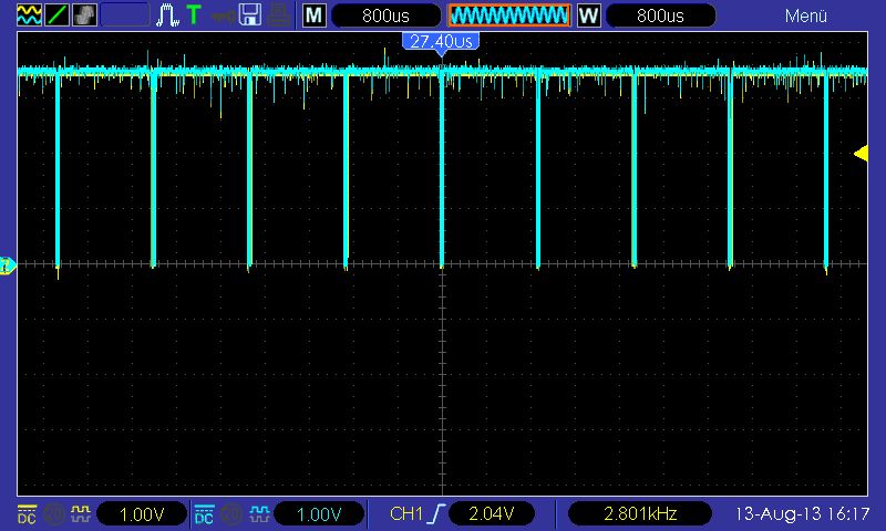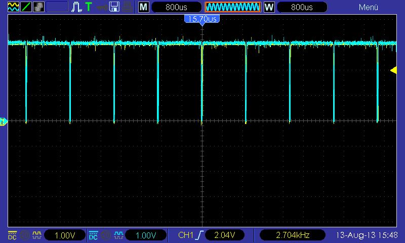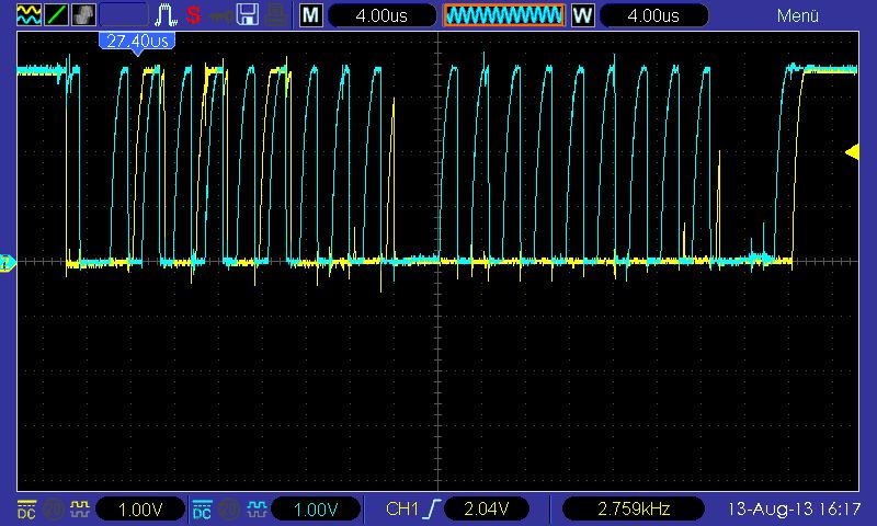 holger schrieb: >>Ich habe ein Oszilloskop zur Verfügung... > > Dann zeig doch mal Bilder. Tastkopf auf 10:1 versteht sich. OK, das sind jetzt vier Oszilloskop-Bilder, mit den Kondensatoren über den Pull-Ups. Bild_1: Stecker zu den Motortreibern ist nicht aufgesteckt, dieses Signal kommt mit einer Frequenz von ca 625Hz immer wieder wobei jedesmal ein andere Motortreiber versucht wird anzusprechen, insgesamt sind es sechs. Bild_2: Das ganze etwas herausgezoomt. Bild_3: Sofort nach dem Start des Programms mit angeschlossenen Motortreibern. Bild_4: Nach maximal 3 Perioden, nachdem ich den Stecker aufgesteckt habe.