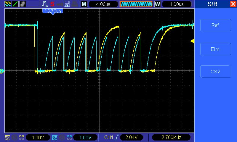 Matthias Sch. schrieb: > Bild 5 sieht ja ganz anständig aus, aber die anderen zeigen, das da was > im argen ist und die kpazitive Belastung viel zu hoch ist, daher die > sägezahnartigen Anstiege. > 470pF sind auch sehr viel, deine Oszi Spitze wird höchstens so 50pF > haben und in der Richtung solltest du mal dimensionieren - wenn > überhaupt. Denn eigentlich läuft I2C über vernünftige Länge (max. so > 50cm) auch ohne kapazitive Belastung, lediglich mit richtigen Pullups > versehen. 4k7 benutzt du immer noch? Es lohnt sich, da nochmal etwas > stärkeres auszuprobieren, evtl. sogar 1k bis 3k3. Im schlimmsten Fall > terminierst du an den beiden Enden des I2C mit jeweils dem doppelten > Wert, also z.B. 6k8 oder so. Hi, schon einmal vielen Dank für deine Antwort! Die Leitung ist auf der Platine ca. 3-4cm lang und dann das Kabel zu den Motortreibern ca. 8-10cm. Wobei ich wie gesagt mit einer anderen Platine und dem gleichen Kabel/Motortreibern keine Probleme habe. Hast du eine Erklärung wo die kapazitive Belastung herkommen könnte? Kann ich versuchen mit isolierter Alufolie, oder sonst irgend etwas das Kabel zu den Motortreibern abzuschirmen? Wie genau terminiere ich denn eine I2C Leitung? In welcher Reihenfolge sollte ich am sinnvollsten mein Glück versuchen? Pull-Up 3,3k Pull-Up 1k zusätzlicher Kondensator(ich habe leider nur 0,01uF als nächste Größe nach 470p) EDIT: Mir fällt gerade ein das ich doch noch jede Menge Keramikkondensatoren habe, die sind halt nur nicht in SMD-Bauform, also am besten 22pF oder 47pF?)