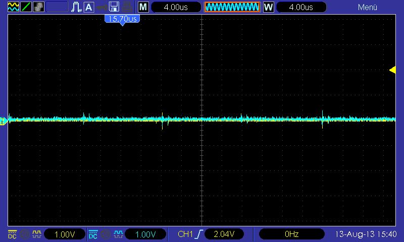 Matthias Sch. schrieb: > Indem du die Masseklemme deines Oszis direkt am Minuspol der Stromquelle > anschliesst, also am Akku Minus oder Netzteil Minus und dann mit dem > Tastkopf deine Motor-GND, MC-GND usw. unter Last auf Störungen misst. Im > Idealfall sollte da gar nichts sein, da die Masse einen sehr niedrigen > Widerstand bildet, bei dir allerdings wirst du an den GND lustige > Sproddler und Spitzen sehen, sobald die Motoren drehen. Du hattest vollkommen recht (siehe Bilder)! :( Wo kommen diese Spitzen denn eigentlich genau her? Liegt das möglicherweise an meiner Powerplatine, die aus den 14,8V, 3,3 und 5V generiert? Die Motoren drehen sich übrigens nicht, während der Aufnahmen. Wie sieht denn nun eine konkrete Lösung dafür aus, damit meine ich mit was für Materialien kann ich mehr oder weniger provisorisch eine Möglichkeit finden, diese Störungen zu unterdrücken?