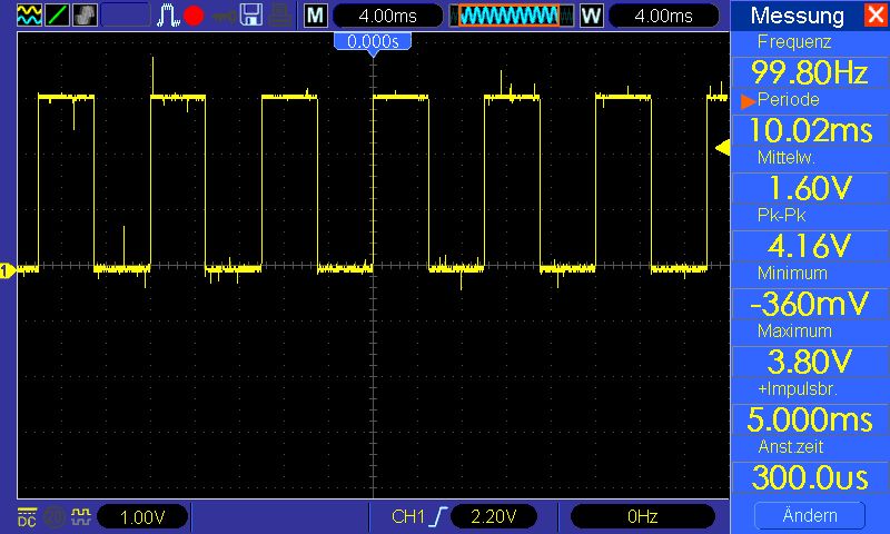Frank M. schrieb: > Ich habe auch noch nie mit ARM gearbeitet, das mit der PWM sieht doch > aber gut aus. > Du denkst du hast eine Periode von 20ms eingestellt, in echt bekommst du > aber eine Periode von 10ms und die sehr sauber und schön. D.h. der uC > läuft schon mal nicht mit 31kHz :-D > > Ich würde mal spontan sagen, der Timer arbeitet nicht mit 84MHz sondern > mit den 168 MHz die der uC maximal abkann. Irgendwie muss ich da einen Faktor falsch eingerechnet haben oder was auch immer... Mir ist mein Problem mit den Timings heute allerdings noch aufgefallen und zwar habe ich die Zeit über eine delay Funktion bestimmt, diese wiederum wird aber von Interrupts unterbrochen. Wieso das stolze 3 Sekunden innerhalb von 10 Sekunden sind kann ich zwar nicht nachvollziehen aber gut, mit einem absoluten Timer habe ich 20Sekunden exakt abmessen können! Ich habe inzwischen 2,2k Ohm Pull-Ups an den Bus gemacht und werde dann noch mal eine zusätzliche Schirmung am I2C-Kabel anbringen. Mal schaun was sich dann ergibt. Hoffentlich gibts dann morgen irgendwelche Ergebnisse... Dietrich L. schrieb: > GND.gif: > Auch wenn es hart klingt: mit diesem mickrigen und zerfledderten > GND-Netz kannst Du nicht mit einem stabilen Arbeiten rechnen! Zumindest bleibt mir diese Erfahrung nun wohl für immer im Kopf und den Fehler begehe ich kein zweites mal... :)