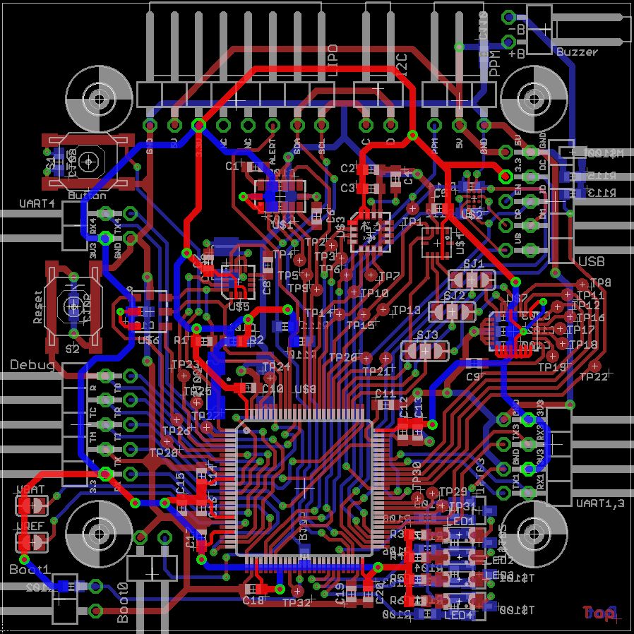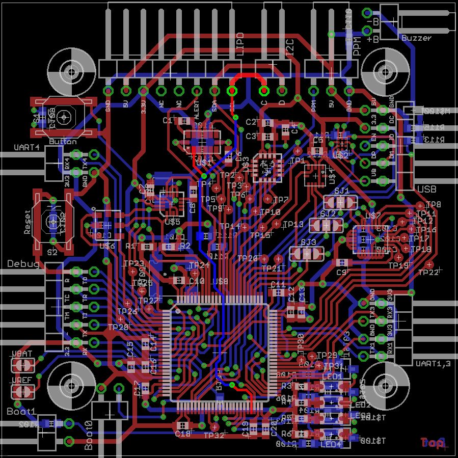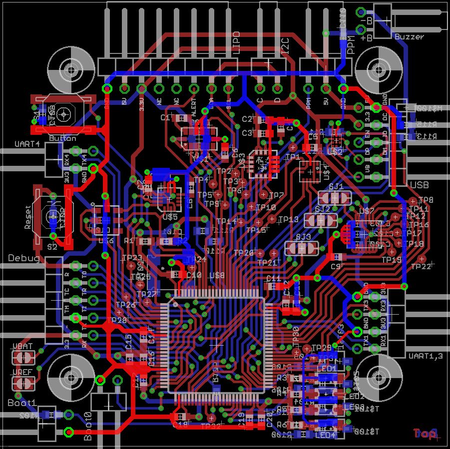 Wenn er kaputt wäre, wie kann der uC dann überhaupt laufen? Und wie kann der I2C Bus dann ein Signal mit 400kHz erzeugen? Also irgendwas passt da bei deiner Messung nicht. Und wenn du auch mit dem internen etwas falsches raus bekommst, dann machst du auch was grundlegendes falsch. Du kannst auf einen Ausgang ja mal ein PWM Signal legen mit einer bestimmten Frequenz und dieses Signal dann am Oszi messen. Noch was zur Platine: Du meintest zwar du kannst nichts mehr ändern, aber ich würde es dir wärmstens empfehlen. Zum einen ist es mir schleierhaft warum du alle Sensoren in doppelter Ausführung hast von unterschiedlichen Herstellern. Den LSM330DLC mit Gyro und Acc, dann einen Acc mit Magnetsensor extra, einen Gyro extra, einen Magnetsensor extra. Ebenso hast du sie gut verstreut über die ganze Platine gesetzt und nicht in die Mitte des Hexacopters oder in einem System angeordnet. D.h. jeder Sensor braucht eine extra kalibrierung und extra Berechnungen um den Offset vom Mittelpunkt zu korrigieren. Der Vorteil des LSM330DLC ist ja unter anderem, dass Gyro und Acc in einem Package dicht beieinander sitzen und idealerweise würde sie in der Mitte des Hexacopters sitzen. Beim HMC5883L bspw. hast du auch die Hinweise im Datenblatt nicht beachtet und Leitungen, ja sogar Bauteile, unter dem Sensor geführt, was sich negativ auf dessen Funktion auswirken kann. Bauteile sind sowohl oben als auch unten, obwohl auf der Oberseite für alle Bauteile genug Platz gewesen wäre.