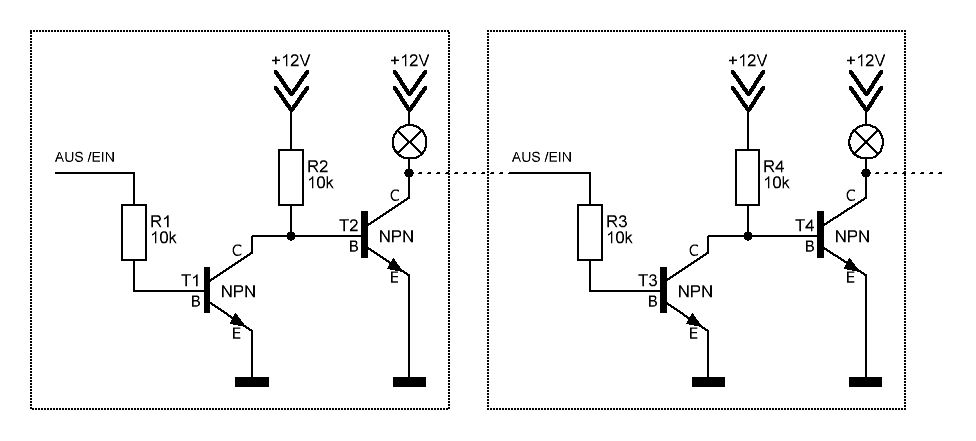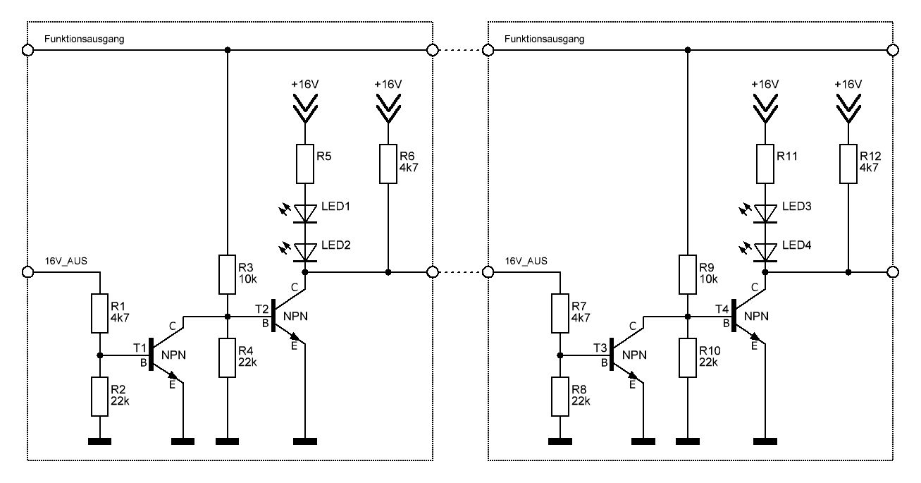 Hey Markus, Schafft der Transistor denn überhaupt die 2 16V Spannungen? Klar, es fällt noch was an den LEDs ab, aber wäre es nicht besser wenn die Einspeisung mit den Widerständen R6 und R12 (auf deiner Skizze) nicht am T2 bzw T4 angeschlossen und somit separat wären?