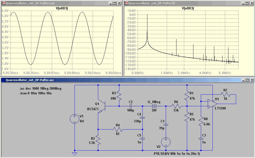 > ich suche aktuell nach einem guten analogen Design für einen 1MHz > Sinusoszillator Analog ist relativ. AD9833 liefert den Sinus quartzstabil und sauber bei geringstem Bauteilaufwand (ein Tiny10 dazu). Ein nicht-quartzstabilisierter Oszillator erfordert zumindest eine Trimmung, aber der Aufbau wäre komplex. Ein quartzstabilisierter Oszillator erfordert zumindest eine Amplitudenregelung, was den Klirrfaktor erhöht. Der Kompromiss wäre ein quartzstabiler Wien-Oszillator mit Amplitudenregelung durch eine Glühlampe http://circuits.linear.com/443 könnte man mit schnelleren OpAmps auf 1 MHz umdimensionieren. MAX038 oder XR2206 sind das schlechte beider Welten: Nicht stabil genug und unsauberer Sinus und hoher Bauteilaufwand. Ein Rechteckoszillator mit nachfolgendem Filter wäre wenigstens noch quartzstabil zu bekommen.