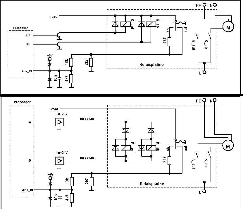 Ich möchte mir eine Rolladensteuerung bauen. Hierzu habe ich bereits Steuerleitungen 2x2x0,8 sternförmig von zentraler Stelle zu allen Rolladenschalter unter Putz verlegen lassen. Die längste Leitungslänge beträgt ca. 20m. Die Steuerleitung ist geschirmt, jedoch hat der Elektriker zum Teil den Beidraht der Schirmung an den Enden der Leitungen abgeschnitten. Am Rolladenschalter ist eine spezielle UP-Dose vom Hersteller Kaiser vorhanden, in die die Relais zum Schalten des Motors sollen. Der Jalousieschalter bei der Dose soll von der Rolladensteuerung ausgewertet werden. Daß zu den Rolläden nur eine 4-adrige Leitung verlegt ist, ist etwas unpraktisch. Habe mir folgendes ausgedacht (Bild oben): * je eine Steuerleitung pro Relais * eine 24V-Leitung zur Versorgung der Relais und Versorgung der Schalterauswertung * Schalterstellung wird analog über die 4. Ader eingelesen. Die Relaisplatine liefert mit einem Spannungsteiler je nach Schalterstellung folgende Spannungen an die Steuerung, die dort auf 5V-Pegel herunter geteilt werden: - Schalter offen: 0V - Schalter AB: 12V - Schalter AUF: 24V ~~~~~~~~~~~~~~~~~~~~~~~~~~~~~~~~~~~~~~~~~~~~~~~~~~~~~~~~~~~~~~~~~~ Nun habe ich Bedenken, ob das mit der gemeinsamen 24V-Ader für Relais und analoge Spannung überhaupt gut funktioniert. Habe mir daher eine zweite Variante ausgedacht, wo je nach Polung der Ader "A" und "B" das Relais "AUF" oder "AB" anzieht (Bild unten). Theoretisch müßte es funktionieren. Hat jemand Erfahrungen mit solchen Schaltungen? Gibt es einen Treiber, der einen 5V-Eingang hat und je nach Eingangspegel satte 0V und satte 24V ausgibt?