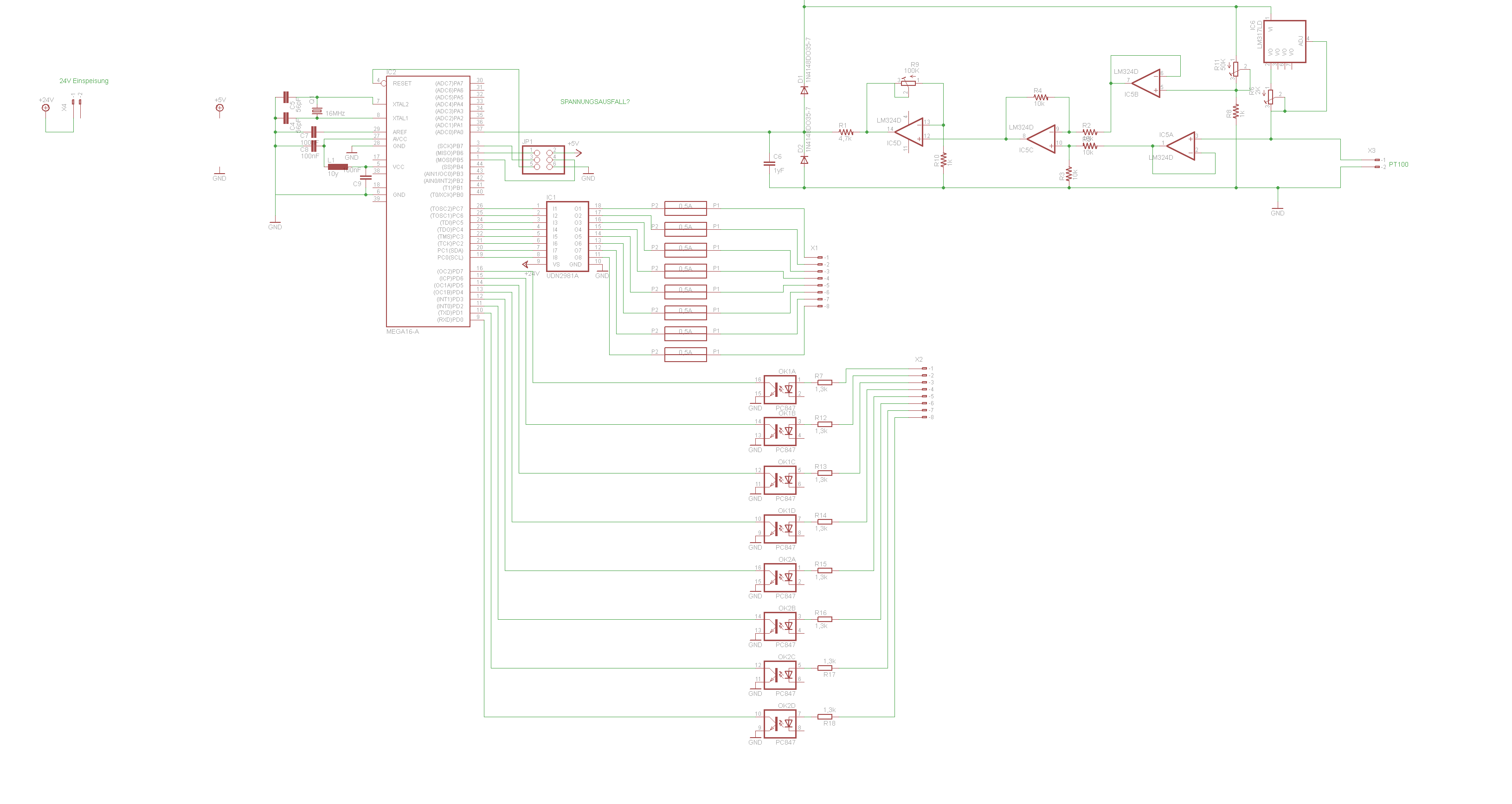 > Spannungsversorgung von 12V/-12V DC und 5V für einen Mikrokontroller und > ein paar Operationsverstärker und einige IC´s. Da ich die Platine mit > 24V speise Könnte man ja mit +24V ---+----+---+-------- +12V | | | 47k 47uF +--7805-- +5V | | | | +----+----+--|+\ | | | | >--+--- 0V 47k 47uF +--|-/ | | | | |L272| +----+ +---(----+ | | Masse --+--------+-------- -12V erreichen. > Also nicht sehr viel, siehe Schaltplan, Du willst nicht ernsthaft diese kranke den teuren Pt100 zum Treppenwitz verkommen lassende Schaltung nachbauen, deren Ausgangssignal mehr von der Temperatur des vollkommen ungeeigneten LM317 (5mA Mindeststrom) abhängt und der Versorgungspannung (Spannungsteiler als Referenz), als vom Pt100. Schreibe 100 mal: Die Schaltung ist Murks. Da niemand weiß, was du wie messen willst, bleibt ein Rat für die richtige Schaltung aus. Vielleicht DS18S20.
