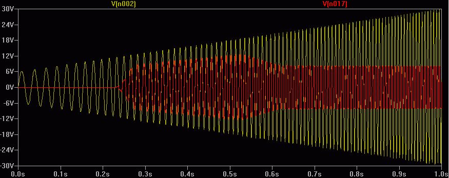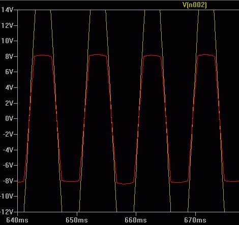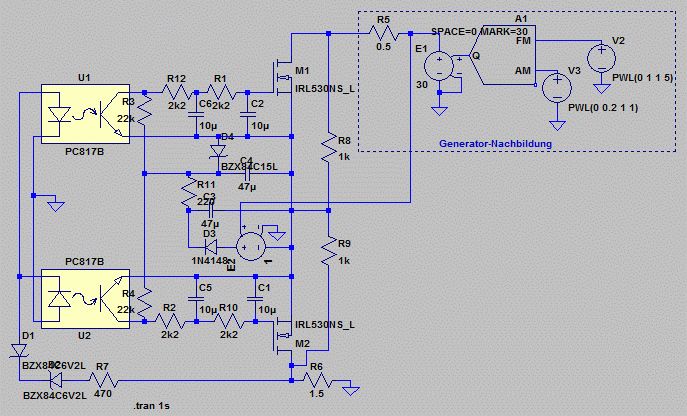 Anbei eine LT-Spice Simulation eines AC-Längsreglers mit zwei gegeneinandergeschalteten MOSFETS: ist nicht optimiert, die Regelung läßt sich sicher verbessern. In gelb die erzeugte Leerlaufspannung, hochlaufend in Frequenz und Amplitude. Mich wundert ein wenig, dass die Spannung am Lastwiderstand R6 (rot) so rechteckförmig aussieht. Ich hätte gedacht, dass so ein MOSFET im aktiven Bereich eher wie ein Widerstand agiert, aber der scheint stark spannungsabhängig zu sein.