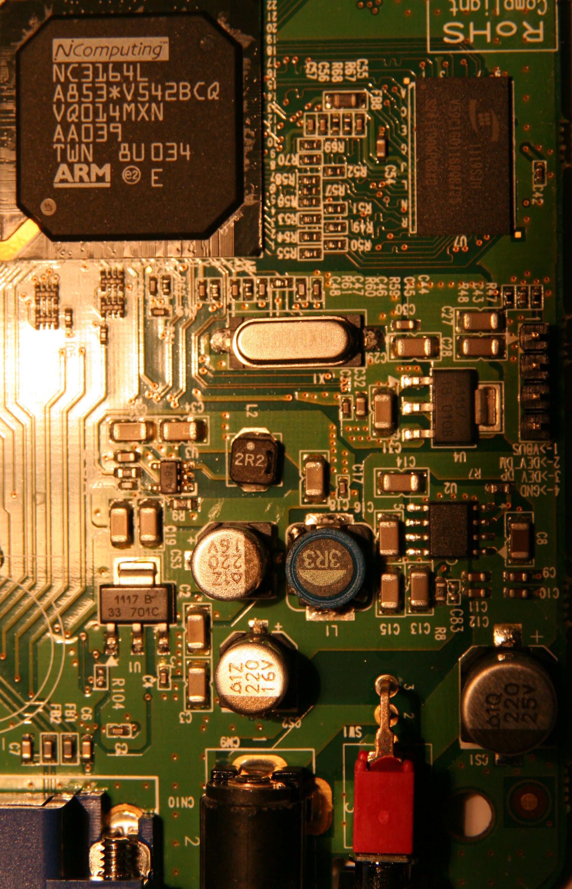 Hallo, ich habe 2 defekte Thin Clients (NComputing L300). Sie booten nicht mehr. Ich vermute ein Problem mit der Spannungsversorgung. Es gibt eine 12V Eingangsspannung, diese wird mit einem Schaltregler auf 5V gebracht. Dann gibt es noch eine Linearregler auf 3.3V. Diese Spannungen sind stabil vorhanden. Es gibt aber noch einen IC wo ich auch vermute das es ein Spannungsregler (U3) ist, dieser liefert aber nichts sinnvolles. Eingang/Ausgang jeweils nur 5V oder 0V. Welche Spannung braucht so ein ARM denn so? Weiß jemand was der U3 (AJ9Z) für ein IC sein könnte? (kleiner ic links von L2) An dem Quarz kann ich keine Schwingung messen, auch ein RX,TX connector liefert kein Signal. Der ARM scheint also nichts zu machen.