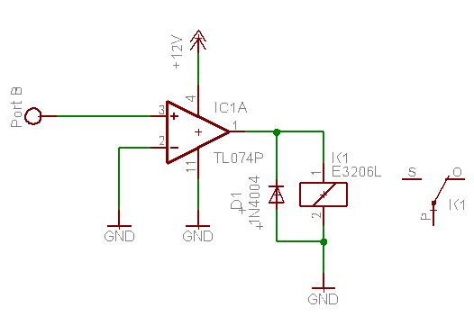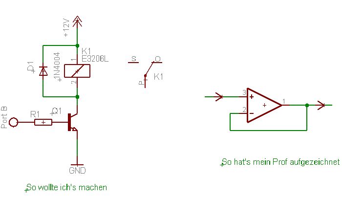 Würde ein REED-Relaise nehmen. Dieses kann direkt vom Portpin geschalten werden (von zuhause mitnehmen ;-)). Die Schaltung mit dem OP ist nicht ok. Wenn er als Spannungsfolger für 12 V genutzt wird, muss seine UB auch auf 12 + 1 Volt liegen. Werden aber nur 5 V rauskommen...Wennschon dann den OP als Verstärker (2,5 fach)mit Zehnerdiode.... Funktionieren tut es auch mit einem Komparator. Der Prof. weis aber nicht, wie diese Schaltung aussieht. Sollte selber mal einen Elektronikkurs besuchen :-) OP's die solche Lasten treiben können, sind viel teurer als zB.Transistoren. Der TL.. schon 10 mal nicht... Freilaufdioden sind auch nicht sehr teuer.......... Auch die Schaltung mit dem Transistor ist in der Praxis höchst problematisch. Vorallem, wenn mehrere Relaise geschalten werden sollen. Am ehesten funktioniert's noch mit Darlingtons. LG Josef