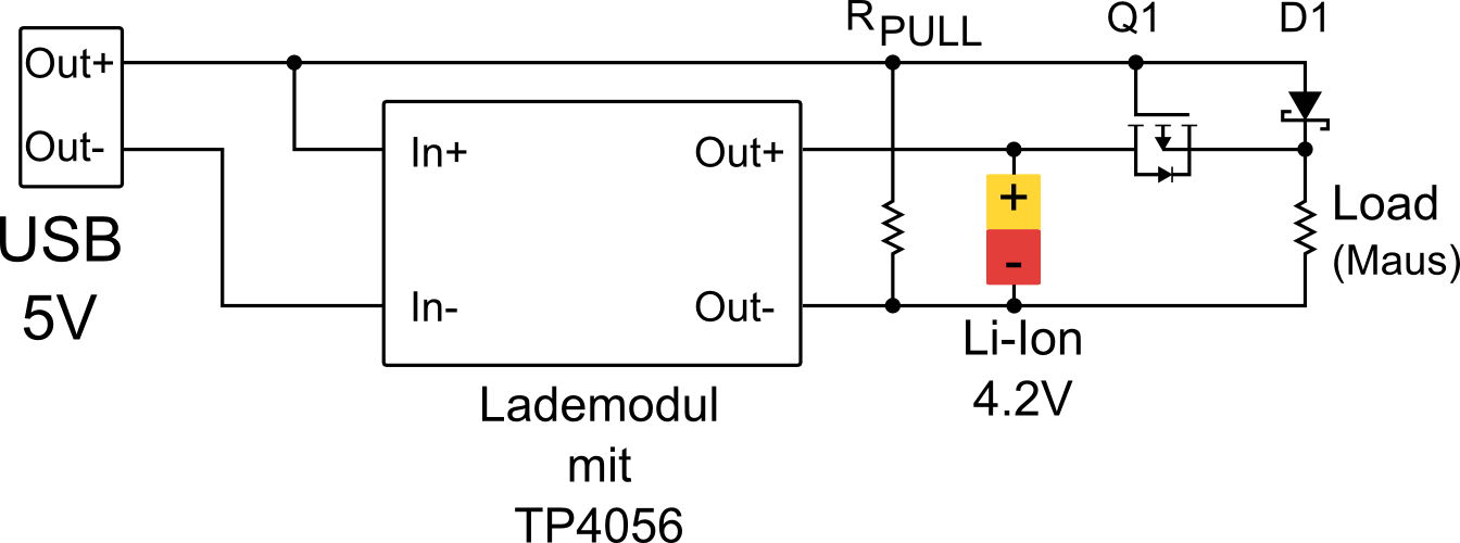 Guten Tag, ich bin dabei meine Maus zu erweitern. Bei der Maus handelt es sich um eine Logitech MX1000, welche über eine Dockingstation geladen wird. Ich würde jedoch gerne die Maus auch während des Ladevorgangs weiter nutzen. Ich habe bereits einen Anschluss an der Vorderseite der Maus angebracht und versucht diese während des Ladevorgangs zu nutzen, jedoch nimmt die Maus dann keine Eingaben mehr entgegen. Als Lösung habe ich mir ein kleines Lademodul zugelegt, mit dem das ganze auch super funktioniert, jedoch müsste ich es jetzt noch so erweitern, dass während des Ladevorgangs die Maus ihren Strom von dem externen Anschluss (USB 5V) bezieht, und nicht von der Batterie, da sonst der Lade-Controller nicht feststellen kann ob der Akku voll aufgeladen ist, oder nicht. Ich habe zwar einen Schaltplan dafür gefunden, bin jedoch NOCH ein Anfänger in der Elektronik. In dem Schaltplan wird ein MOSFET P-Kanel, eine Schottky-Diode und ein Widerstand verwendet um das ganze zu realisieren. (Seite 2 http://au.element14.com/images/e14/content/common/supplier/microchip/1305/PDF/AN1088.pdf) Wenn ich das richtig verstanden habe, wird der Widerstand benötigt um den MOSFET wieder zu entladen(?, also wieder auf On zu schalten) und die Schottky-Diode nur um die Bahn zuverkürzen, sollte die externe Quelle nicht angeschlossen sein. Nun weiß ich leider nicht was für einen MOSFET ich benötige und welcher Widerstand dazu passen würde. Ich habe mir bereits einiges durchgelesen, musste das ganze aber leider mit einem rauchenden Kopf abbrechen. Deswegen würde ich euch gerne fragen was für einen MOSFET, welchen Widerstand und welche Schottky-Diode (falls nötig) ich für dieses Vorhaben benötige und ob mein Schaltplan so passt. Der MOSFET muss bei 5V (USB) am Gate sperren. (Externe Quelle angeschlossen). Der MOSFET muss Source-Drain 4.2V durch lassen. (Externe Quelle nicht angeschlossen). Falls möglich würde ich mich auch über eine kleine Erklärung freuen :) Vielen Dank für eure Hilfe.