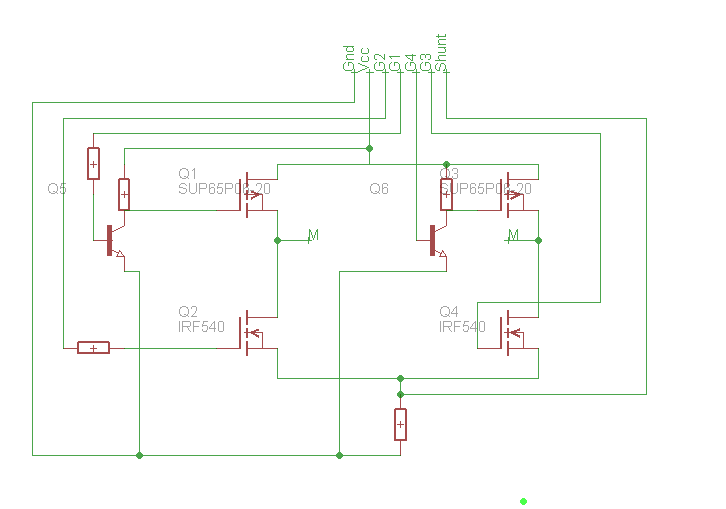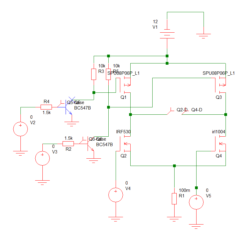 Hallo, zur zeit versuche ich ein DC Motor 12V/5A mit einer H-Brücke anzusteuern. Beim versuch selber bleibt es dann aber auch. Da ich nicht mehr weiter weiß dachte ich mir frage ich mal hier nach. Wenn alle Gates keine Spannung haben sollte kein Mosfet leiten aber irgendwie leited der Q1 trotzdem und Q3 nicht, was schon sehr komisch ist wenn müssten beide leitenden oder keiner. Wenn ich es normal beschalte: Q1=Q4=on;Q2=Q3=off; oder Q1=Q4=off;Q2=Q3=on; Läuft es nach der Simulation mit Simetrix richtig. Ich habe Q1=Q2=Q3=Q4=off; gar nicht in betracht gezogen für mich selber war es klar wenn alles off ist dann leitetet keiner. Erst als ich dann die Schaltung fertig gelötet habe, habe ich festgestellt das all=off; trotzdem leitetet. Eigentlich sollten die anderen Zustände zu mindestens funktionieren, aber leider läuft das auch nicht. Später habe ich dann herausgefunden das bei den N-Kanal Mosfets der Widerstand zwischen Vgs sehr niederohmig ist somit liegt das immer an Gnd. Im Anhang findet ihr ein Bild von der Schaltung in Simetrix. Ich hoffe mir kann jemand sagen was da schief habe noch nicht soviel Erfahrung bei sowas:( Mfg