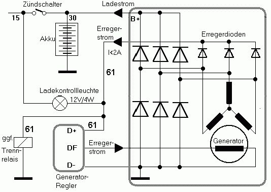Habe schon mehrmals gelesen, dass die Restwelligkeit auf der Boardspannung ziemlich schwer auszuwerten ist, und auch die Messgeräte die der Tüv dafür verwendet Teilweise nicht zuverlässig funktionieren, besonders wenn der Ladestrom nicht sehr hoch ist. Wenn ich direkt an einer der Phasen der Lichtmaschine messe, dann ist das doch dasselbe wie "Klemme W" oder? Vielleicht hab ichs schlecht erklärt, hab mal noch einen Ausschnitt aus dem Stromlaufplan des Autos angehängt. Wenn ich z.B. das rote Kabel von der Lichtmaschine nehme, dann hätte ich doch eine sinusförmige Wechselspannung oder? Die sollte sich doch mit der Schaltung Auswerten lassen... Gruß Joachim