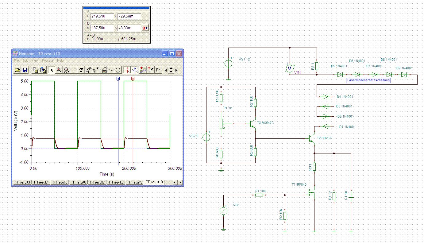 Ich hab eine Simulation gemacht. So würde ich das aufbauen. Man kann in grün das Schaltsignal vom Controller sehen. Hier 10kHz und in rot ist der Laserstrom. Der bewegt sich sauber zwischen 50mA und 732mA. Und man kann das Einschwingen schön sehen. Versuch das mal so umzusetzten! Gruß, Jens