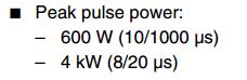 Hubert schrieb: > Was > bedeutet die? Das ist die Testbedingung. die 600W hält die Diode bei einem Stoßimpuls mit 10us Anstiegszeit und 1000us Impulshalbwertsbreite aus. -> also etwa 0.6 Joule für einen einzelnen Impuls wenn man den Puls als "Dreiecksimpuls" betrachtet. Gruß Anja