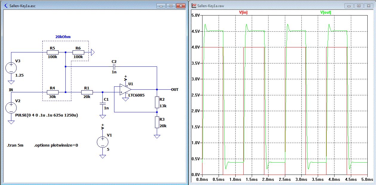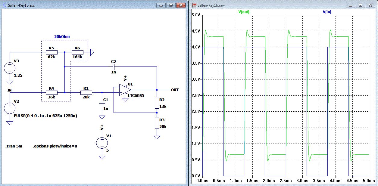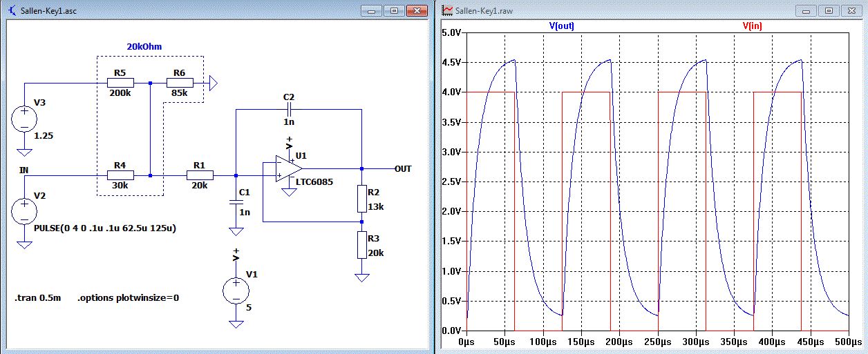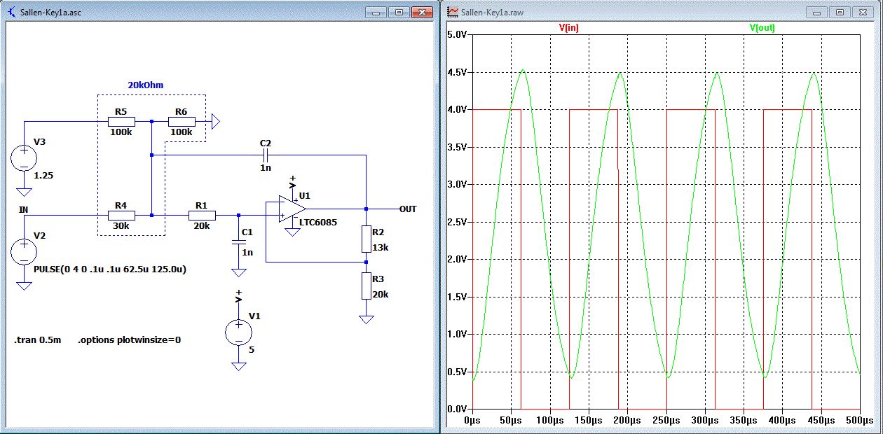 So würde man es für 4V dimensionieren. Die Parallelschaltung der 3 Widerstände ergibt 20kOhm. Nachtrag: Wenn man mit 1/10 der Frequenz simuliert, dann stellt man fest, dass es bei 0V Eingang noch etwas knapp ist. Also noch etwas mehr anheben. Zum Simulieren habe ich LTspice verwendet. Das ist ein kostenloser SPICE-Simulator. Einfach auf die .asc-Datei klicken und dann die Simulation starten.