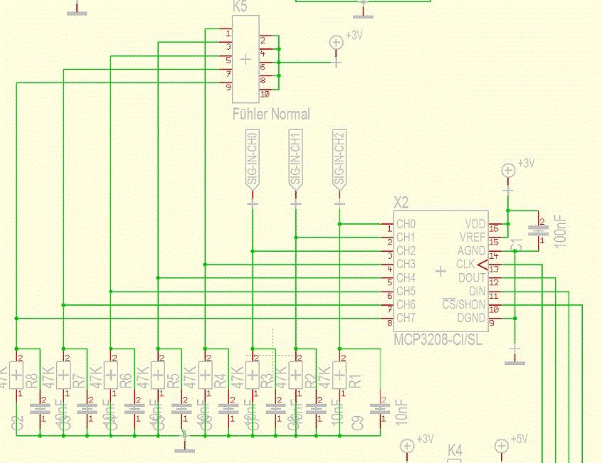 Servus Leute, Ich bitte Euch um hilfe. Ich hab hier einen Schaltplan mit einen A/D Wandler MCP3208, an dem Thermometer angeschlossen sind. Die Schaltung funktioniert soweit schon in der Praxis, ich hab allerdings nachträglich die Kerkos noch mit eingefügt. Am MCP zwischen AGND und VDD einen 100nf und bei jedem Eingang einen 10nf. Nur weiss ich jetzt nicht ob ich das so richtig gemacht habe. Vielen Dank für Eure Antwort! Gruß, Marco