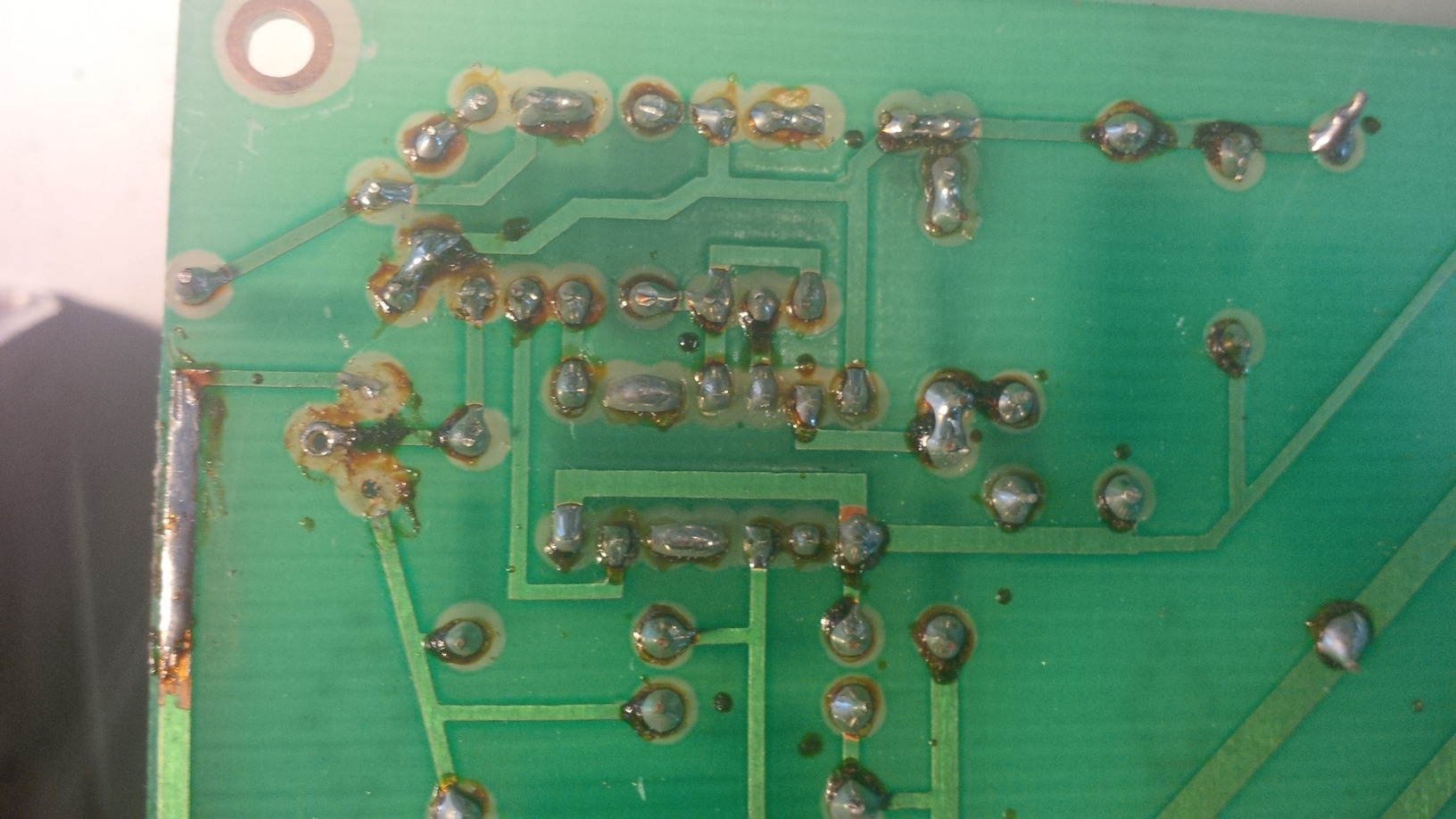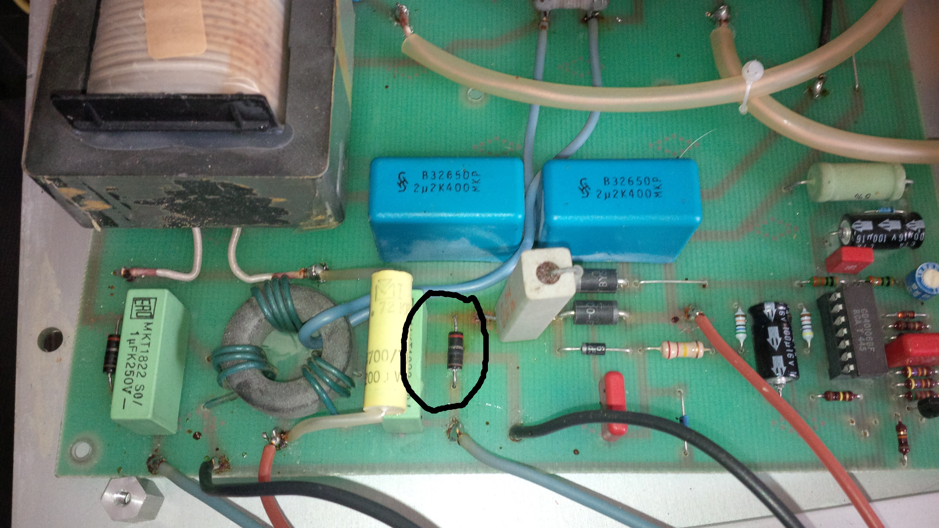 Ich habe jetzt die beiden vermeindlichen Spulen ausgelötet: 11,2 Ohm (referenz) und 6,0 Ohm (die vermutlich defekte). Unter der defekten Spule ist die Platine durch Hitze verfärbt und das Gehäuse weist Risse auf (daher die Vermutung). Das da etwas fehlt hat mich auch gewundert. Auf der Rückseite kann man sehen, dass schon mal etwas "repariert" wurde. Bei dem IC handelt es sich um 6 Schmitt-Trigger (CD40106BF) Ich werde heute mal zum Bastelladen gehen und versuchen die Spule zu bekommen.