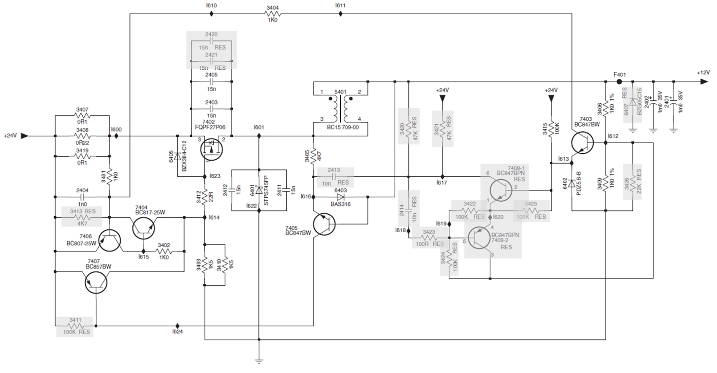 Der MOSFET wird über 3403 und 3410 eigentlich immer eingeschaltet, es sei denn 7404 oder 7407 ist eingeschaltet. 7404 ist eingeschaltet, wenn 7406 eingeschltet wird durch Überstrom am shunt 3407 3408 3419 oder durch ausreichende Ausgangsspannung wenn 7403 eingeschaltet wird. Ist der MOSFET erst mal ausgeschaltet, bleibt er auch ausgescgaktet bis die Spule ihre Ladung in den Ausgang gepumot hat, also ihre Eingangsseite sich über die Diode knapp unter 0V abstützt und ihre Ausgangsspannung über der Eingangsseite liegt. 7408-1 7408-2 soll wohl eine jndervoltage lockout Anlaufverhinderungsschaltung sein, aber wenn ich grau hinterlegt richtig deute fehlt die bei dir. 7405 ist also fürs sperren zuständig so lange Strom oder Spannung noch nicht zu hoch sind.