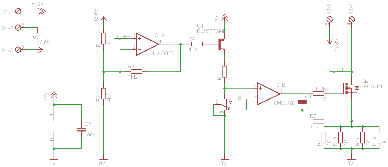 Nabend, ich habe vor mit einem Kollegen eine mobile "Standbox" zu bauen die in einem KFZ geladen werden soll. Diese Strandbox beihaltet einen Lautsprecher, ein Radio sowie Den Blei Acku. Damit die Kiste auch auf Reisen immer funktionstüchtig ist hatten wir nun die Idee die Batterie am KFZ bordnetz zu laden. Nun habe ich mir überlegt das es ja eigentlich nur eine Konstantstromladung ist, welche später in eine Konstantspannungsquelle umschaltet. Wäre von euch einer so nett sich den Schaltplan anzusehen, da ich noch nicht so viele Erfahrungen mit Analogschaltungen habe. Der IC1A ist der OP welcher als schmitttrigger geschaltet ist. Dieser soll die Umschaltung von Konstantstrom zu Konstantspannung übernehmen. IC1B ist für die Ansteuerung des Mosfets und somit für den Konstantstrom verantwortlich :) Achja noch ein paar Eckdaten, Die zu ladene Batterie hat 7,2Ah bei 12 V also ist ein Ladestrom von maximal 750 mA angepeilt. Die konstante 12V versorgung werde ich noch dazu bauen, die schaltung habe ich übersichtshaber noch nicht mit eingefügt. Die Bauteile sind weitestgehend SMD mit ausnahme der Klemmleiste,1 Ohm widerstände und des Mosfets. Achja und ich habe diese Schaltung auch mal simuliert in Multisim, da ist mir kein grober Schlitzer aufgefallen. Aber beim "Supply system of Hell" dachte ich frage ich mal besser nach ;) . Vielen Dank für eure Mühen :)