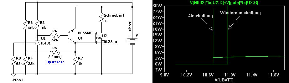Hysterese, dann schaltet der MOSFET bei niedriger Klemmenspannung aus,