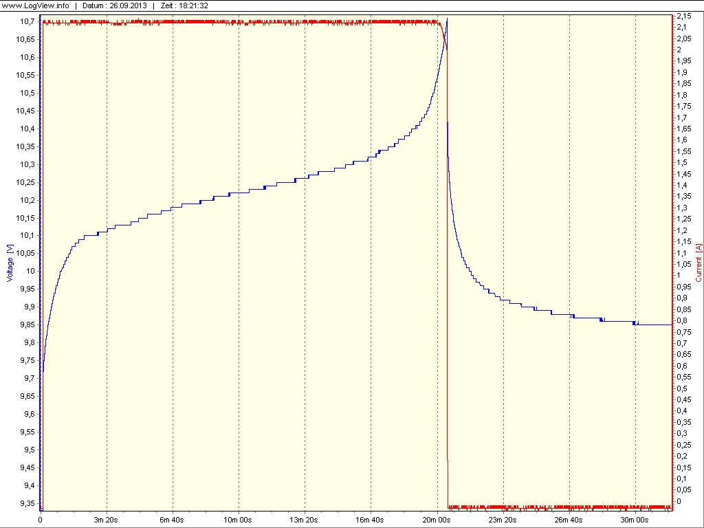 So, das eine Problem konnte ich selbst lösen. Nun sieht man schön wie die Ladespannung bis ca. 10,9xV ansteigt und dann von der Spannungsversorgung getrennt wird und das der Strom bis dahin konstant bleibt. Aber mit LogView muß ich noch ein wenig üben. Hoffe da gibt es einen Cursor bzw. ein Fadenkreuz, wo man die Maximalwerte und/oder Momentanwerte auswählen kann. Dies ist für mich in soweit wichtig, da mir aufgefallen ist, das beim PowerLog 6S im Main Menu, also dort wo der Strom angezeigt wird, die Gesamtspannung 180mV niedriger angezeigt wird als in der Einzelzellenanzeige. Jetzt möchte ich natürlich wissen, welcher Wert davon im Diagramm dargestellt wird. Bernd_Stein