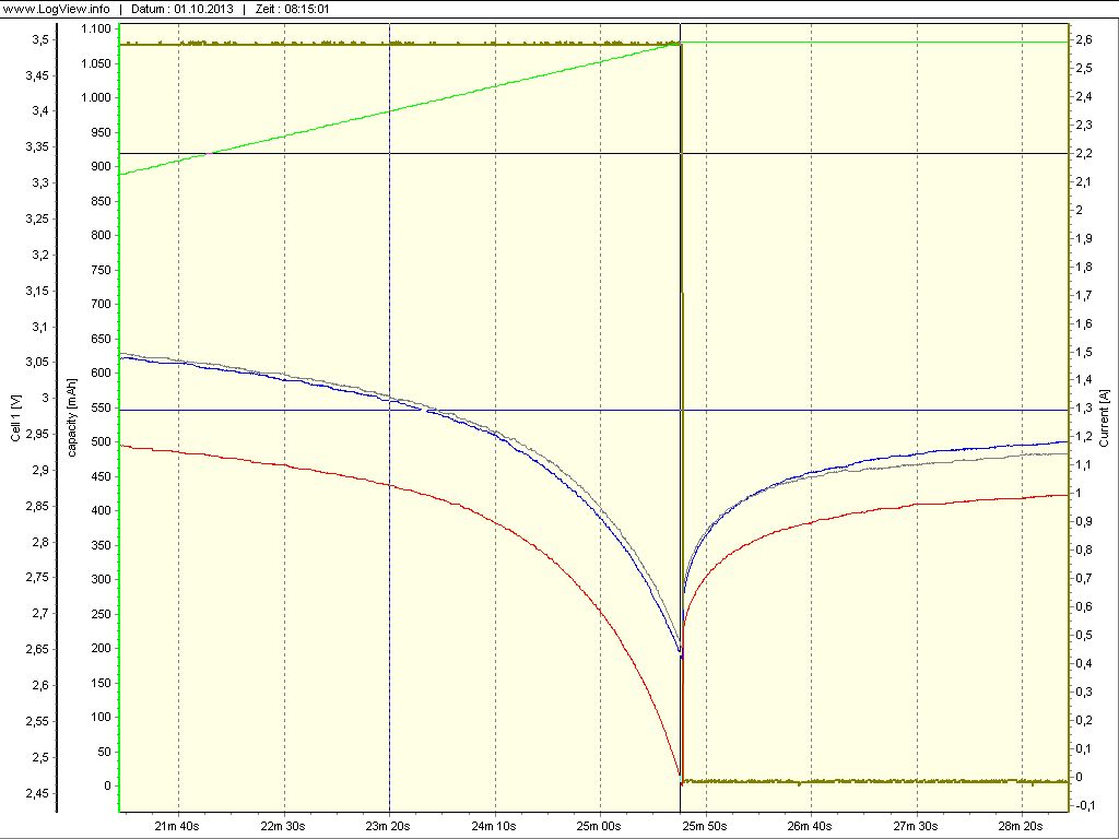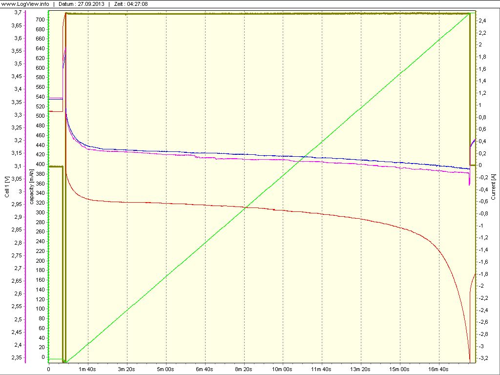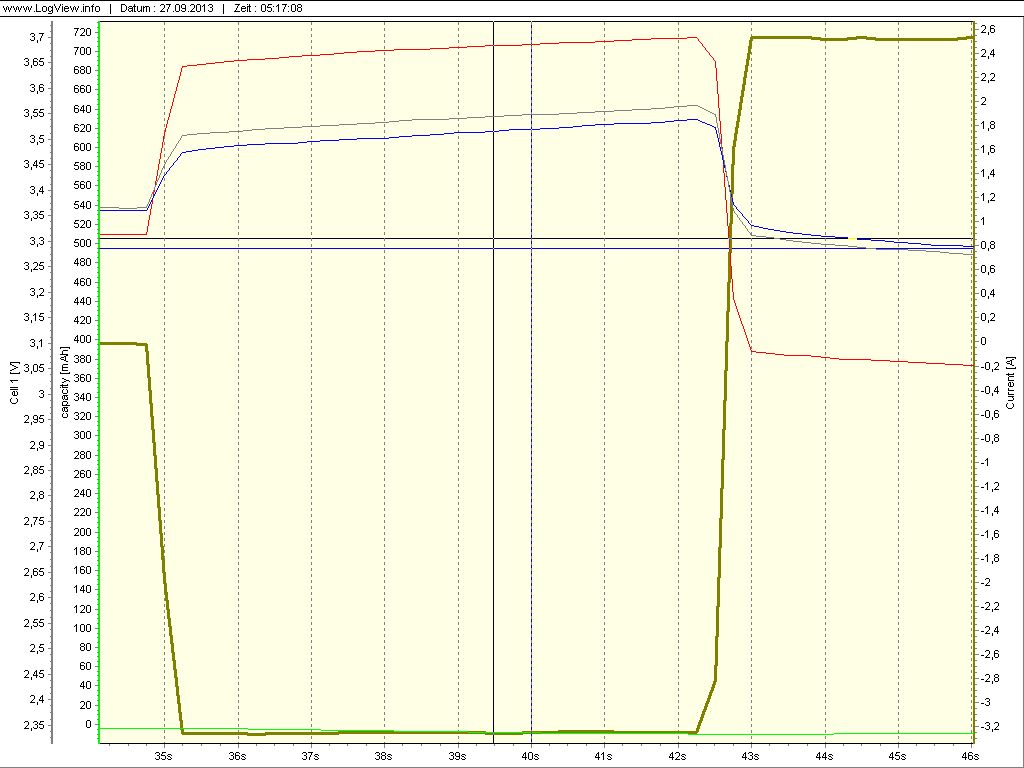 Zu Anfang war das Netzteil zwar auf Stromsenke geschaltet, jedoch war der Spannungsregler noch auf 15V eingestellt, so das zunächst noch ein konstanter Ladestrom von ca. 3,3A für sieben Sekunden fließt. Dieser wird als negative Linie dargestellt, da der Aufbau ja eingentlich für das Entladen verkabelt ist. In dieser Zeit sind die Zellenspannungen um 60mV angestiegen. Begonnen haben die einzelnen Zellen mit folgenden Spannungen : Zelle 1 ( Rot ) = 3,314V Zelle 2 ( Blau ) = 3,361V Zelle 3 ( Grau ) = 3,365V Als ich dies bemerkte und den Spannungsregler gegen Null zurückgedreht hatte, so das die Entladung nun zum Tragen kommt, kann man sehen, das die Zelle 1 ( Rot ) anscheinend deutlich mehr in der Spannung zusammenbricht als die beiden anderen Zellen. Dies ist jedoch im Mittel nur eine Differenz von ca. 250mV zur Zelle 2 ( Blau ) mit ihrer höchsten Spannungslage gegenüber den anderen beiden. Die Zellen 2 und 3 ( Blau und Grau ) weichen nur ca. 20mV von einander ab. Dies bleibt auch über die meiste Zeit der Entladung so. Den Entladevorgang habe ich manuell abgebrochen, sobald eine Zelle 2,50V erreicht. Ich muß schon sagen das ist eine super Sache mit dem *PowerLog 6S* und LogView. Beim PowerLog 6S kann man Alarme einstellen, die sich akkustisch sowie über einen Offenen Kollektor Ausgang bemerkbar machen. Ich nutze die akkustische Warnung die anschlägt sobald eine Zelle die eingestellte Schwelle von 2,50V erreicht. Zum Zeitpunkt des Abklemmens des Akkupacks war die Spannungsdifferenz von Zelle 1 ( Rot ) 2,335V zur Zelle 2 ( Blau ) 3,089V ca. 800mV. Die Zellen haben zu diesen Abschaltkreterium eine Kapazität von ca. 700mAh abgeben können. Man kann also schon erkennen, das mit solch einer einfachen Ladeschaltung ( Konstandstrom von 2C bis die Ladeschlußspannung von Zellenzahl x 3,65V erreicht ist ) schon gute Ergebnisse zu erzielen sind. Außerdem welch eine hervorragende Qualität diese Zellen haben. Ich war bereits erstaunt als ich meine sechs Zellen zu Anfang gemessen hatte - alle 3,30V. Mal sehen ob ich es schaffe das die Zelle 1 ( Rot ) bei den nächsten Tests nicht mehr so von den anderen beiden Zellen in der Spannungslage abweicht. Bernd_Stein