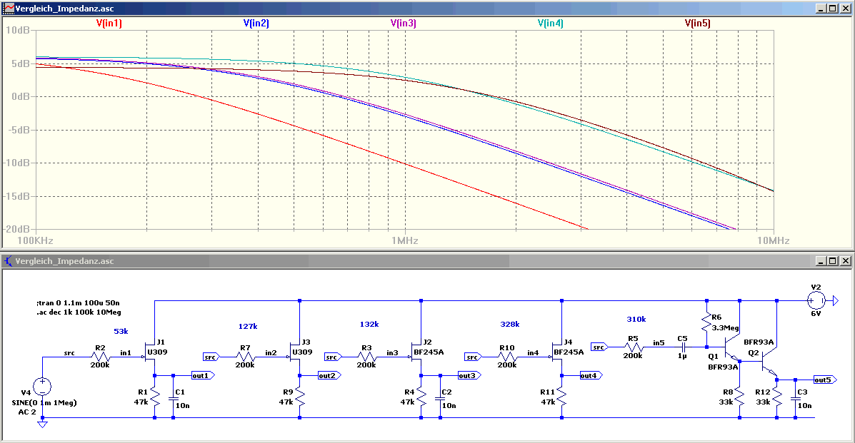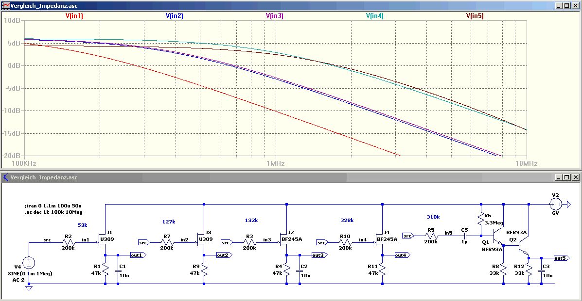 Die heff-Gleichung bezieht sich auf die Leistung. Was ist mit dem rausgekürzten E gemeint, die elektrische Feldstärke? Ich kann mir vorstellen, dass die Formel bezüglich Spannung so passt. Im Rothammel hab ich nur was ähnliches für Ferrit-Antennen gefunden. Ukreis = 2 Pi N A Q / Lambda Bei meinen Simulationen haben sich Spannungsüberhöhungen von 10-20 dB ergeben. Der Innenwiderstand beträgt dann z.B. 300 kOhm, die Eingangsimpedanz der Demodulatoren haben meist deutlich weniger (50 - 130 kOhm), was dann die Güte kaputt macht. > http://litetec.hubpages.com/hub/AM-Detectors Da wird der U309 verwendet, dieser teilt sich ein Datenblatt mit dem J310. Die Steilheit ist fast doppelt so groß wie beim BF245, deshalb ist das demodulierte Signal im Vergleich zur HF noch relativ hoch. > FET infinite impedance detector Infinite Impedanz gilt korrekterweise nur für NF. Schon bei ein paar MHz sinkt die Impedanz soweit ab, dass Bipolar-Transistoren wieder mithalten können (Siehe Anhang). Die Eingangsimpedanz bei 1 MHz hab ich jeweils danebengeschrieben, aber der Fairness halber muss jede Variante an einem Ri=200k zeigen, was sie kann. Eine reine Eingangs-Kapazität des Transistors wäre ja nicht unbedingt störend, denn die fliesst einfach in die Schwingkreiskapazität mit ein. Aber z.B. eine BE- oder GS-Kapazität in Reihe mit einem Widerstand bedämpft den Schwingkreis. Eventuell ließe sich ein JFet mit deutlich geringeren Kapazitäten finden.