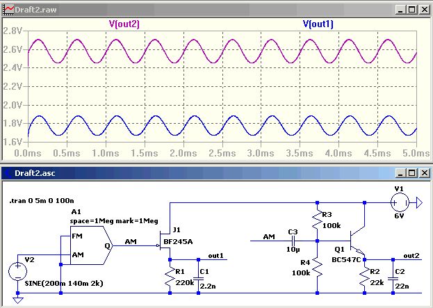 Ja, das ist die Krux. Mit 100K //1nF ist die G-S Kapazität schon stark merkbar. Mit 3k9 ist die Steilheit klein. Na ja, BF245 und dann BC547 werde ich versuchen. Will aber schon 20 mVpp demodulieren. Auch interessant http://de.wikipedia.org/wiki/H%C3%BCllkurvendemodulator Natürlich bis 2 MHz. Werde was entwickeln ohne Komparator, sodass jedenfalls die Schwellspannung rausfällt. Ist das oben schon die demodulierte Schwingung? Es soll ein Diodenersatz werden in einer selektiven Detektorschaltung, die an den Berthold Bosch Detektor herankommt. LG Rudi