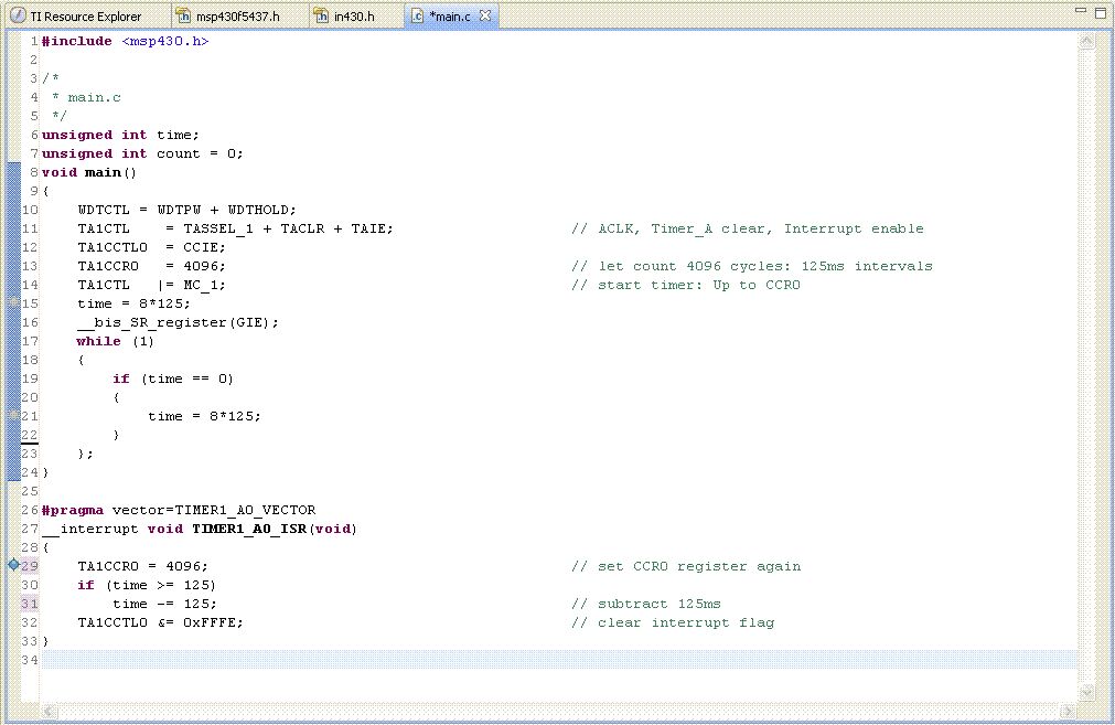 Hallo, ich programmiere aktuelle mit der CCS-Entwicklungsumgebung einen MSP430-F5437. Ich habe eine einfache Timer-Initializierung geschrieben, die alle 125 ms einen Interrupt auslösen soll (Clock = ACLK, Timer zählt bis 4096). Bei jedem Interrupt wird eine Variable "time" (Wert = 1000 = 1s) um 125 verringert, sodass nach 8 Interrupts 1 Sekunde voll ist (time == 0) und im main-Programm die If-Anweisung erfüllt ist. Mein Problem: Nach dem ersten Interrupt wird das Programm resetet und starten von vorne. (Daher ist natürlich die Time Varibale wieder 1000 und ich erreiche nie das ziel time == 0) Woran kann das liegen? (Watch dog ist natürlich aus!) Anliegend findet ihr meinen Code. Ich hoffe, ihr könnt mir helfen. LG Kristin