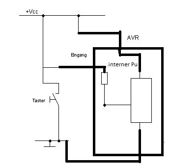 Hallo liebe Community, ich habe ein kleines Verständniss Problem bezüglich der internen Pull Up's. Im Bild, welches im GCC-tut ist folgendes Bild für den Anschluss eines mech. Schalters an den µc abgebildet. Im Text etwas tiefer steht geschrieben "Die AVRs verfügen an den meisten Pins über zuschaltbare interne Pull-Up Widerstände (vgl. Abschnitt Interne Pull-Up Widerstände), welche insbesondere wie hier bei Tastern und ähnlichen Bauteilen (z. B. Drehgebern) statt externer Bauteile verwendet werden können" Das ist soweit auch bekannt, nun jedoch meine Frage. Ich habe doch keine Möglichkeit meinen Schalter zwischen den eigentlichen Eingang des µc und den internen Pull Up zu legen. Ich habe hier mal ein zweites Bild angehängt, welches mein Verständnisproblem veranschaulichen soll. Sprich ich hätte ja troz internem Pull up bei geschlossenem Schalter einen Kurzschluss über den Schalter. Weiterhin habe ich aus dem Datenblatt entnommen das die internen Pull Up's einige 10k_ohm groß sind, der Widerstand des eigentlichen Eingangs aber um ein vielfaches größer ist, was den Pull Up Widerstand im zweiten angehängten Bild doch unötig machen würde. Ich hoffe ihr könnt mir dabei ein wenig weiter helfen, oder mir auf die finger hauen falls ich komplett falsch liege. vielen Dank im voraus Grüße Phill