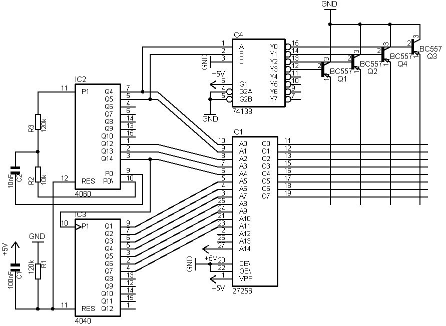 Hier ist die Schaltung: Die noch freien Adressleitungen dienen zur Auswahl des Programms. Der 4060 erzeugt den Takt für den Multiplex, der 4040 dient als Programmzähler. An jedem Kreuzungspunkt liegt eine LED. Ob man das ganze als Stern oder sonst was macht ist egal, die Schaltung kann man für vieles verwenden.