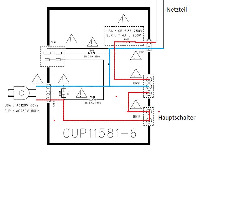 Ich habs noch mal eingezeichnet... Oder hab ich den Schaltplan so falsch verstanden? Der CN21 bekommt den Strom doch erst über BN91 zurück. Über BN91 wird er also quasi eingeschaltet? Denn auf der Mainplatine wo BN91 hingeht sizt auch ein 230V Relais, das würde also hinkommen... Gruß