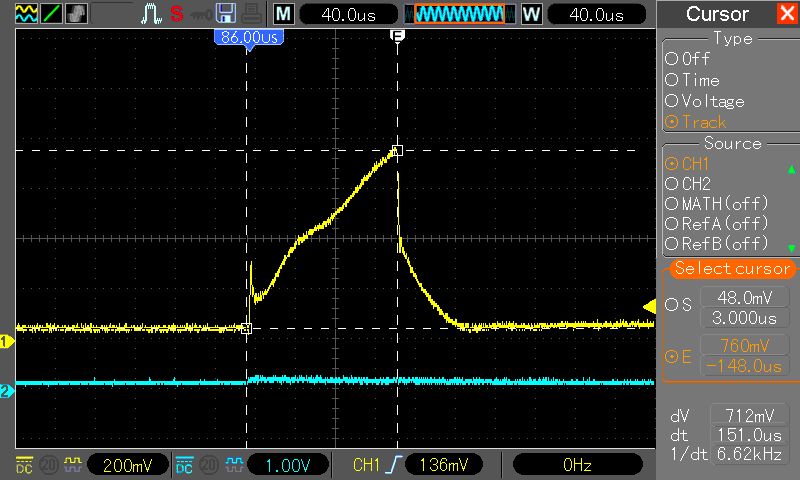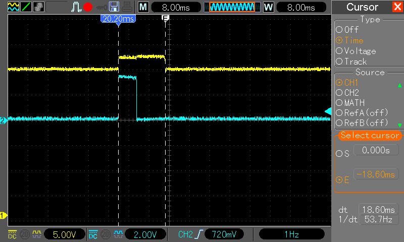 Die Sache lässt mich nicht los. Ich habe erfolglos noch einmal diverse Timing- und Widerstandskonfigurationen getestet. Ich frage mich immer noch, wie die Originalschaltung den Bus so drastisch von 30V auf 0V herunterziehen kann, ohne dass auf der Platine passende Widerstände oder FETs zu finden sind. Das muss also alles in dem ASIC stattfinden. Zusätzlich habe ich nun eine Strommessung (Busleitung Ta zum Haustelefon) während des Sendens des Türöffnungssignals durchgeführt. Im Anhang (gelbe Kurve) ist ein Peak von 150µs zu sehen (1mV im Diagramm entspricht hier 1mA). Der Strom steigt also kurzzeitig auf über 700 mA an. Ist diese Rampe möglicherweise das Startsignal? Hat noch jemand eine Idee, wie ich das Geheimnis messtechnisch lüften kann? Oder was ich noch versuchen kann, um die Kommunikation zu initialisieren? Danke & Gruß Daniel