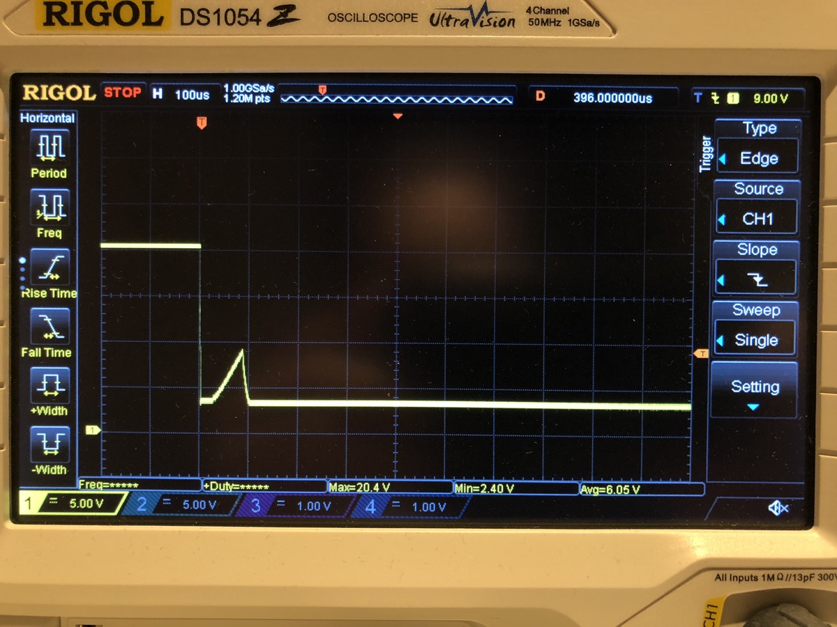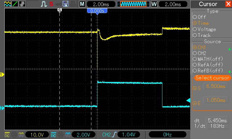 Hallo zusammen, mir ist noch etwas aufgefallen: Ich habe ein kleines Test-Setup aufgebaut und erzeuge nun mittels Mikrocontroller Pulse von 1 bis 22 ms Länge auf dem Bus (mit 1kOhm Last und mit 50 Ohm Last getestet). Bislang habe ich damit aber noch nicht erreichen können, dass der Busmaster die Spannung absenkt. Im Gegenteil: wie die Screenshots zeigen, erzeuge ich Pulse unterschiedlicher Länge durch Anlegen einer 1kOhm Last (blaue Kurve), die Busspannung steigt in diesem Moment sofort an (um ca. 2,5 V). Allerdings tut sie dies immer für genau die gleiche Dauer, ca. 18 ms. Ich dachte zuerst, es handelt sich um einen Überschwinger, der durch das Nachregeln des Netzteils entsteht. Aber dagegen spricht, dass die Dauer des "Überschwingers" scheinbar unabhängig von der Länge meines Lastpulses ist. Jemand eine Idee, was das bedeuten könnte? Sobald der Lastpuls länger als ca. 11 ms andauert, bricht die Busspannung noch einmal kurz ein (auf das Ruheniveau), steigt nach Abschalten der Last aber wieder an. Seltsam. Bin für alle Anregungen offen! Danke & Gruß daniel