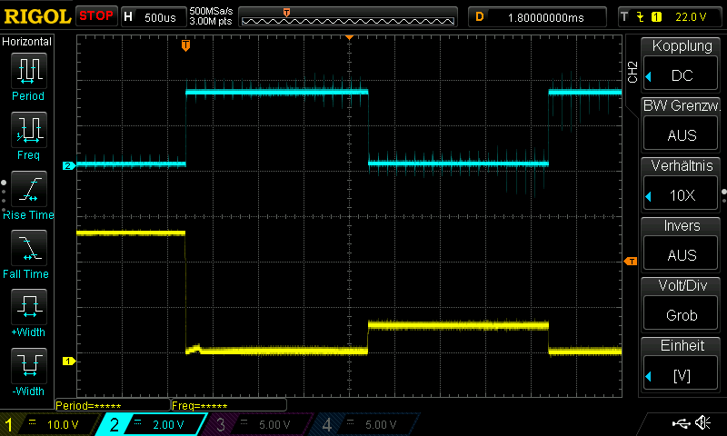 Hallo Conny, danke für Deine detaillierten Untersuchungen, sehr aufschlussreich! Habe versucht anhand Deiner Doku ebenfalls auf dem Siedle in-home-Bus zu kommunizieren. Verfüge hier über ein Siedle BTS 850-02 und möchte - ähnlich wie Du - eigentlich nur den Türöffner über den Bus betätigen können. Dazu habe ich zunächst die Buskommunikation mit dem Oszi beim Drücken der Türöffnertaste am BTS 850 aufgezeichnet (siehe Anhang). Leider werde ich aus Deinen Angaben zum Start der Buskommunikation nicht ganz schlau; für 1 ms auf 50 Ohm Last? 11 ms auf 1k Last? Deine Angaben in den verschiedenen Threads dazu sind nicht ganz eindeutig. Ich habe soweit alle Konstellationen durchprobiert, aber ich konnte bislang nicht erreichen, dass der Busmaster die Spannung für die ca. 65 ms absenkt. Im Anhang siehst Du das Ergebnis, wenn ich mit ca. 50 Ohm Last den Bus für 11 ms belaste (blau = Signalpegel am Mikrocontroller, gelb = Busspannung (Ta) ) Die Spannung bricht zwar kurz ein, wird vom Busnetzteil aber scheinbar direkt wieder ausgeregelt. Wenn ich direkt am BTS 850 die Busspannung (Ta) messe, sehe ich am Anfang der Kommunikation keinerlei Indiz dafür, dass dort das Gleiche geschieht. Übersehe ich etwas? Kannst Du vielleicht noch einmal genauer beschreiben, wie Du die Buskommunikation initialisierst? Es hilft sicherlich auch, wenn Du einen Schnipsel Deines Codes posten würdest. Danke & Gruß Daniel