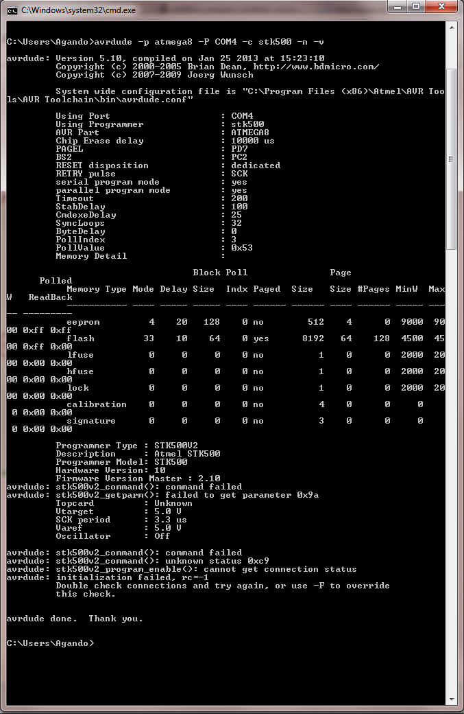 >>avrdude -p atmega8 -P COM4 -c stk500 -n -v