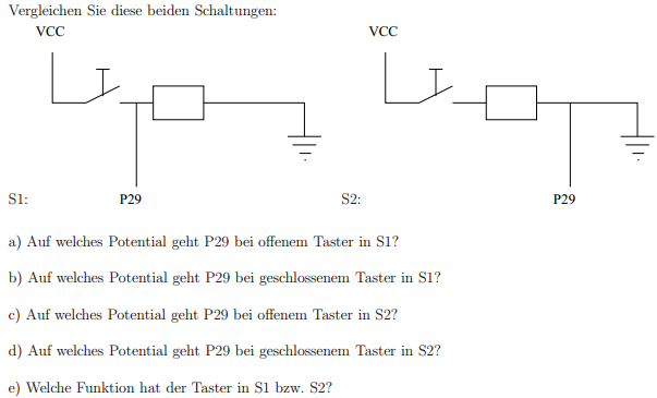 Ich habe ein paar Aufgaben, die ich lösen muss. Die Aufgaben sind als Bild im Anhang. Könnt ihr mir bei deren Lösung helfen? Also ich würde die Aufgaben wie folgt beantworten: a) P29 geht auf "Eigenpotential" b) P29 geht auf das volle Potential von VCC c) P29 geht auf "Eigenpotential" d) P29 bekommt nur ein Teil der Spannung (gemindertes Potential) e) ?
