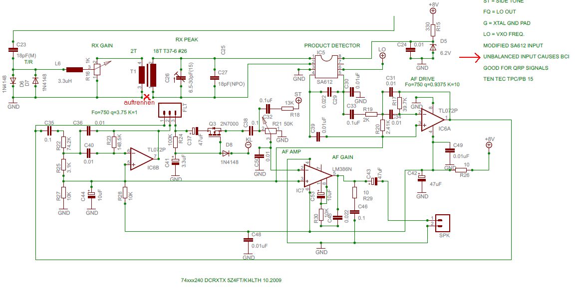 > Wenn der Sender Pause macht Liegt High auf Pin 1 des 74HC240, geht er in den Tri-State-Modus. Das Empfangssignal wird nicht kurzgeschlossen. Der SA612 funktioniert besser, wenn die Eingänge symetrisch beschaltet werden.