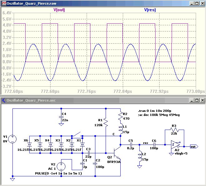 >>>> kontrollieren, ob es von der Antenne einen DC-Pfad nach GND gibt >>> garkein-dc-pfad, die LD-Antenne war direkt am 18p-c angebracht >> Da kommt aber doch das HF-Poti und die Primärwicklung des T1 > Schließt man sie hinter dem C an, ist das Brummen wesentlich leiser. Eine Langdrahtantenne kommt nie alleine. Irgendwas fungiert immer als Gegengewicht. Wird keine Erde angeschlossen, bildet die Schaltung den Gegenpol, dann hast Du schon HF auf dem GND. Wird die Schaltung in ein Gehäuse eingebaut, kann man innen einen definierten Zustand herstellen, weil sich innen alle Spannungen auf die Abschirmung beziehen. >>> Mit 330µH parallel zum XTAL 14.001MHz >>> Mit 1µH parallel sind es plötzlich 14.123MHz >> Bei meinen Simulationen ist es unterhalb von 12-15µH gekippt > Hast du einen getesteten Schaltplan Das sollte unabhängig von der Oszillatoschaltung funktionieren. Die Induktivität bildet mit der Parallelkapazität einen Schwingkreis, wodurch diese Kapazität teilweise kompensiert wird. Liegt die Resonanzfrquenz des Schwingkreises unterhalb der Parallelresonanz des Quarzes, verschiebt sich die Parallelresonanz nach rechts. Liegt die Resonanzfrquenz oberhalb, taucht das Minimum links wieder auf und die Kurve sieht spiegelbildlich aus. Zur Cp des Quarzes addieren sich die parasitären Kapazitäten der Spule und der umliegenden Schaltung dazu. In dieser Simulation würde es mit 40-45µH recht gut funktionieren. Dieses Ziehen mit einer Induktivität wirkt sich nur auf das obere Ende des Frequenzbereiches bei kleinen Ziehkapazitäten aus. >> Es kommen jetzt bei 3.5, 7 und 14 MHz aus dem Vervielfacher > Keramikschwinger lassen sich wahrscheinlich viel > weiter nach unten ziehen als Quarze!?! Ja > Welche Keramikresonator-Frequenzen benutzt du als Ausgangsbasis? Ich benutze einen 3.58 MHz Resonator, der läßt sich mit einm 50 pF Drehko von 3550 kHz bis unter 3500 kHz ziehen. Dann hab ich einen weiteren mit 3.68 MHz. Theoretisch wäre ein lückenlose Anschluss möglich. > abschätzen, wie gut die Stabilität des vervielfältigten Signals ist? Es ist definitiv nicht so stabil wie ein Quarz. Es gibt Versuche, wonach Keramikschwinger bis 7 MHz noch einigermaßen stabil sind, die darüber haben die eine höhere Temperatur-Drift. Dann ist ein verdoppeltes/vervierfachtes Signal stabiler. Momentan ist meiner stabil genug fürs 80m Band, aber für 20m reicht es noch nicht. Es scheint einen Einfluss der Heizspannung auf die Frequenz zu geben. Wenn ich Luft hinfächle, tut sich kaum was. Das liegt an der Schaltung, nicht am Resonator.