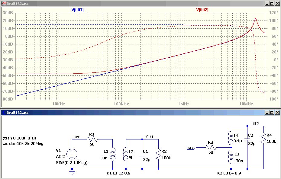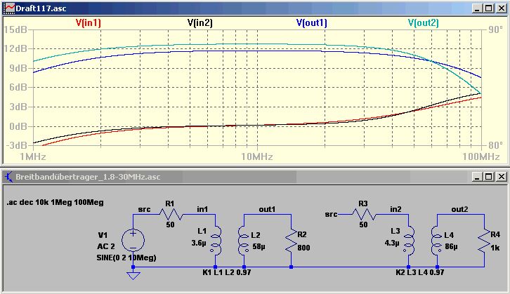 Hallo Dil >> Das Einschwingen geschieht schön rund, aber das Ausschwingen ist eckig. >> Sowas erzeugt einen Klick > sind in der realen Schaltung vier(!) Treiber parallel geschaltet Die Treiber schalten im Nanosekunden-Bereich. Die Verzögerung sollte zwischen 100µs und 1ms betragen. > mit einem Rechteck aus dem AD9850-Komparator angesteuert werden Das Nand wirkt als Komparator. Für mich war es hier einfacher, die Frequenz einzugeben. Es geht auch mit einem Impuls: Pulse(0.5, 4.5, 0, 1n, 1n, 35.214µ, 71.428µ) Anscheinend sieht die Variante ohne Übertrager besser aus und liefert auch gute Leistung (10 Watt). Das Filter hat einen Sperrkreis (Notch), welcher die doppelte Frequenz 28 MHz stärker bedämpft. So sieht das Filter schon besser aus. Ansonsten müsste es dreistufig aufgebaut werden. Bei der Inbetriebnahme müsste man schauen, ob beim Senden der Kern von L1 heiss wird. Dazu wird ein Dummy-Load mit 50 Ohm benötigt. Die Wicklungen L3 und L4 müssen auf dem Kern etwas verschoben werden, um das Filter auf Maximum abzugleichen. Gruß, Bernd