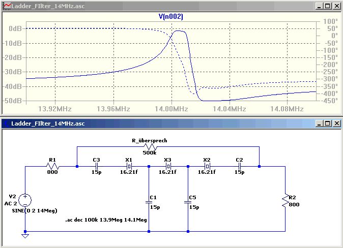 > Mithörton Damit Du Dich beim Tasten selber hörst, als Feedback. > den BFO mit einem Quarz aus der Ladderfilter-Messreihe betreiben Wobei sich der Quarz nach unten viel weiter ziehen läßt als nach oben. > Soll die VFO-Frequenz in der Praxis eigentlich besser über oder > unter der Empfangsfrequenz liegen? Viele Mischprodukte ergeben sich oberhalb der Oszillatorfrequenz. Deshalb ist es sicherer, den VFO oberhalb zu betreiben, damit diese Mischprodukte nicht in den Empfangsbereich fallen. Man kann aber in Einzelfällen davon abweichen, wenn sich dadurch Vorteile ergeben und keine Pfeifstellen entstehen. Liegt die Oszillatorfrequenz beim Mischvorgang oberhalb des Empfangssignals, dreht sich das Seitenband um, unterhalb nicht. Deshalb schlage ich vor, für 80m und 40m den VFO oberhalb und für 20m unterhalb zu betreiben. Damit drehen sich die beiden unteren Seitenbänder um und es wird nur 1 BFO für USB unterhalb der ZF benötigt. Da die Filterflanken sich linksbündig fast decken, könnte evtl 1 BFO-Frequenz für beide CW und SSB reichen. Das angehängte Bild ist nur ein Beispiel eines Filters aus einer vorhandenen Simulation. Das CW-Filter beinhaltet 4, das SSB-Filter 6 Quarze.